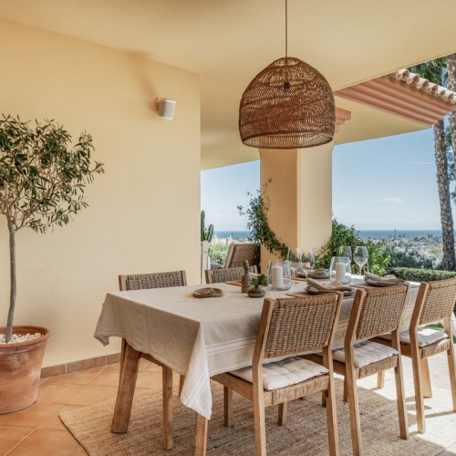 Luxury renovation in Nueva Andalucia. Top quality refurbishment with underfloor heating in the bathrooms and modern fire place. In la Maestranza, a closed development with 24 hours security, very well maintained gardens and green areas with 2 pools (one of them heated). Lovely mountain views with a built in electric BBQ for alfresco dining.The most popular shops and restaurants on your doorstep and only 15 minutes walk to Puerto Banus and the beach. It sold fully furnished so bring your suitcases and move in. Garage space is included in the price.