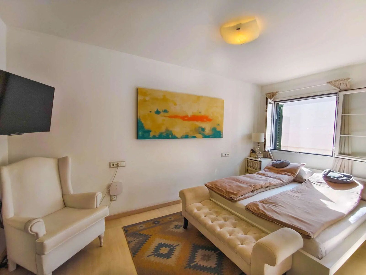 Duplex penthouse in the Porto Pi area, with a 175m2 solarium terrace, less than 2 minutes from the seafront promenade, bus stops, a 24-hour pharmacy, and the Porto Pi shopping center with all its amenities. On the ground floor, there is a small entrance hall, a toilet with shower, a large built-in wardrobe, and a triple bedroom with a dressing room and en-suite exterior bathroom. Up a small flight of stairs is the living-dining room, a fully equipped modern kitchen, another exterior-facing double bedroom with a built-in wardrobe and en-suite bathroom, and a short, beautiful hallway that coincides with the space under the stairs leading to the terrace. The solarium features a 55m2 terrace with views of the sea, the cathedral, and the Porto Pi maritime area with San Carlos Castle and the sea in the background. The entire house is very bright. All rooms are exterior except for the toilet and the upper bathroom. Air conditioning with heat/cold pump is available in the living room and all bedrooms. Gas heating is available in all rooms and in the bathrooms via towel racks. PVC exterior carpentry with double glazing. The price includes a 4.5 m² storage room and a 12 m² parking space. Another 12 m² space is possible. The building was built in 2002 in a traditional Mallorcan style. The building is very quiet with only four neighbors, two per floor. The property is very well maintained. Community fees are approximately €70 per month. There is no elevator and the apartment is located on the first floor and a half from street level and a second floor and a half from the garage.