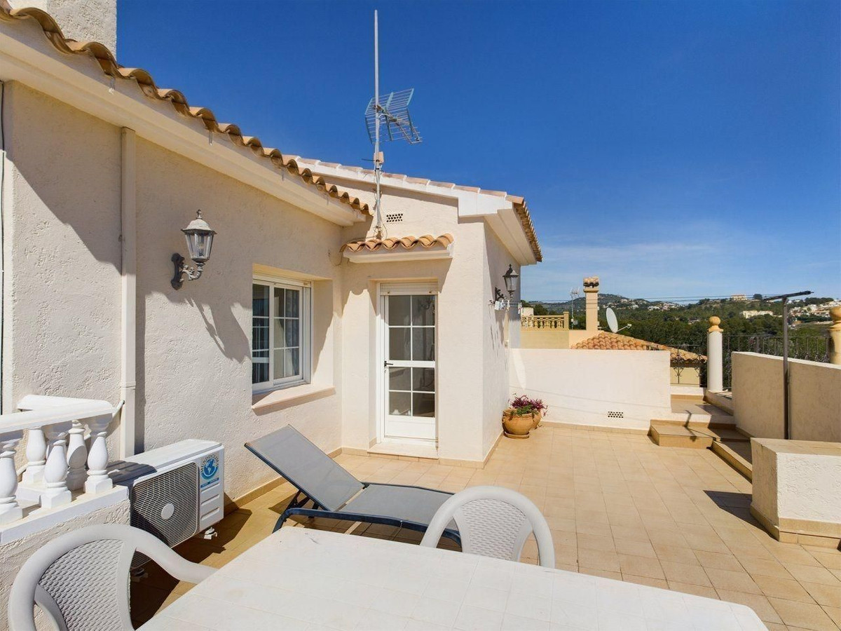 The home consists of an entrance hall, a foyer, 2 living and dining rooms, 2 fully equipped kitchens, a covered terrace with views of the sea and the Peñon de Ifach, an open terrace with stunning views of Mount Olta, 5 bedrooms, 3 bathrooms, a storage room, and a laundry area.