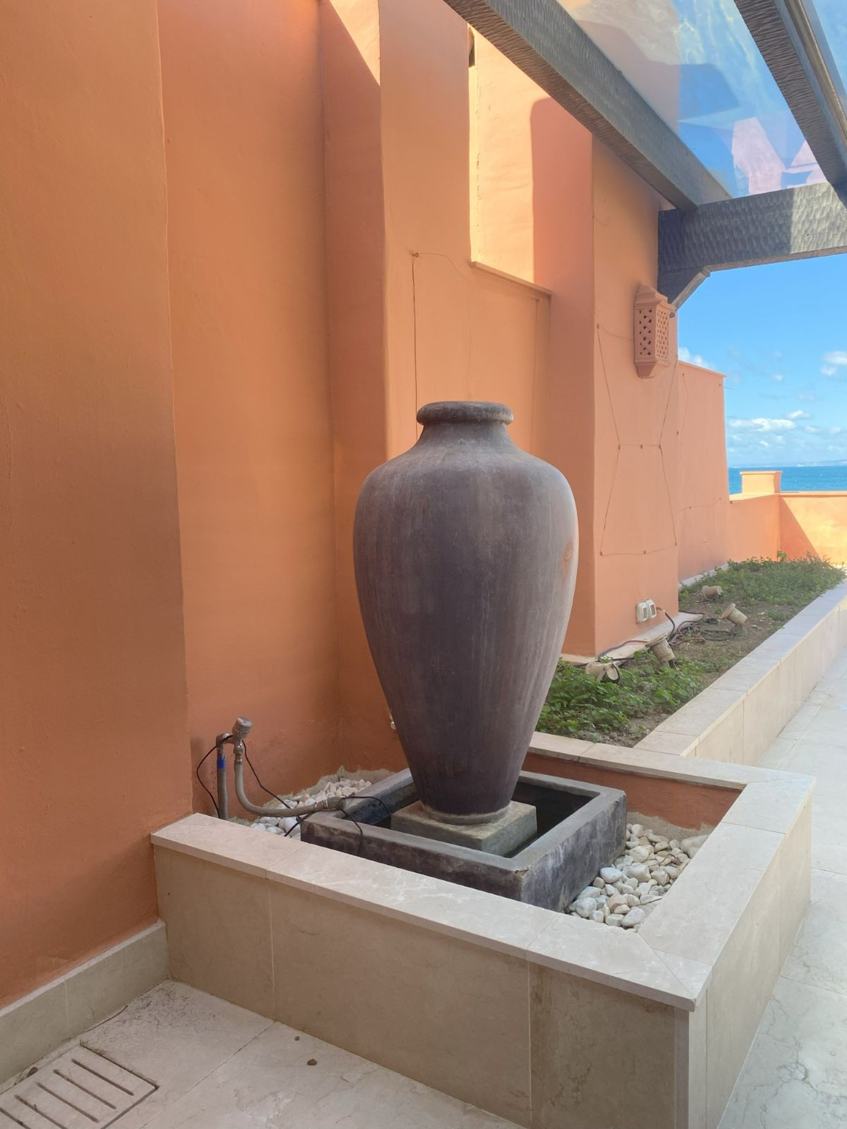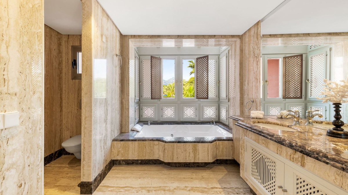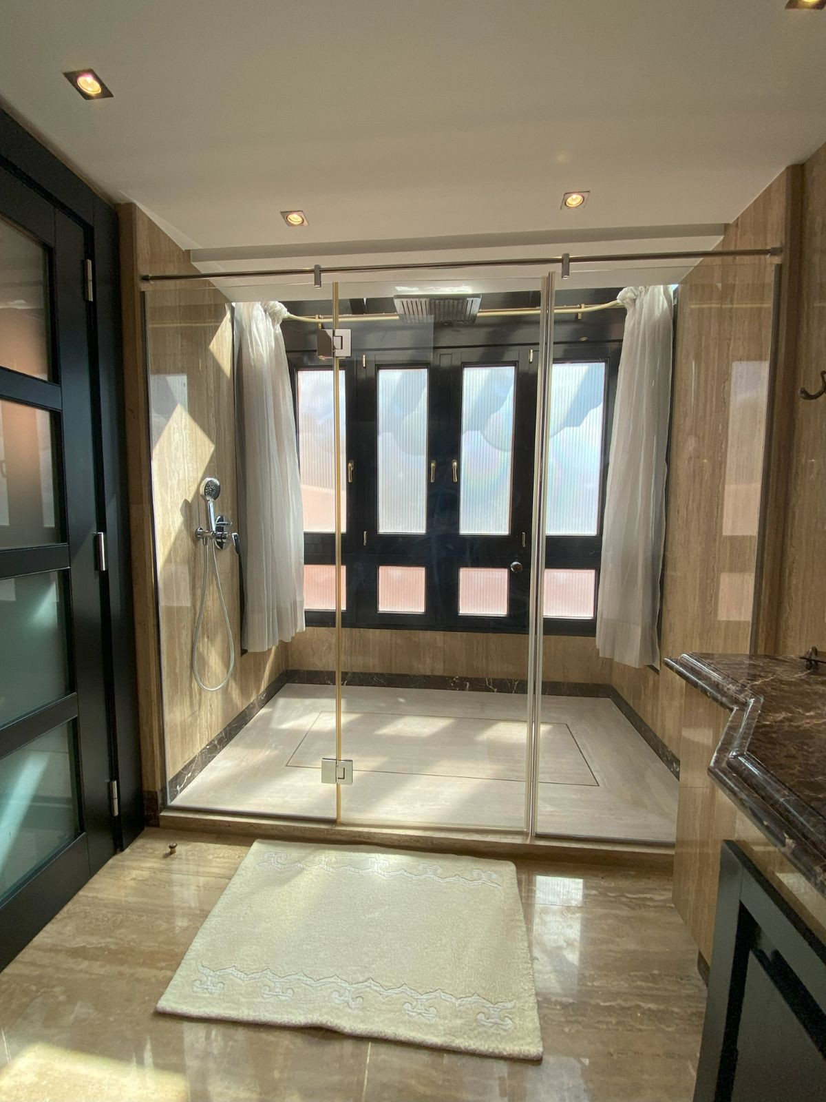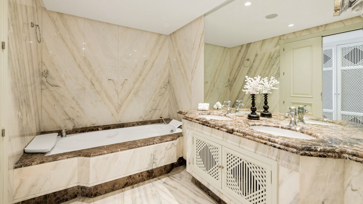 This large duplex apartment has three spacious en suite bedrooms, with build-in wardrobes. The master bedroom, located upstairs, has furthermore a private terrace. The finishings include cream marble floors, underfloor heating, and travertine marble bathrooms and sauna in the master bedroom. The property has been maticulously maintained and is well presented in all areas. In addition, the property has two ample garage spaces and a storeroom included in the price.