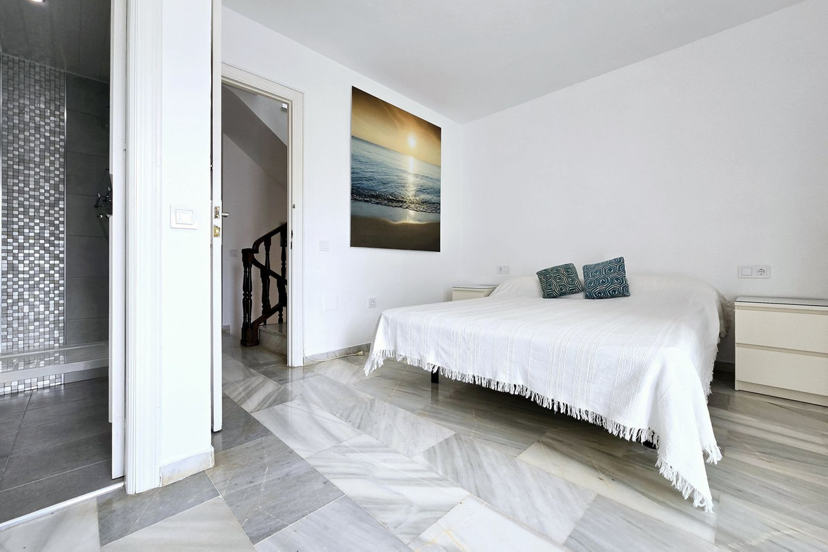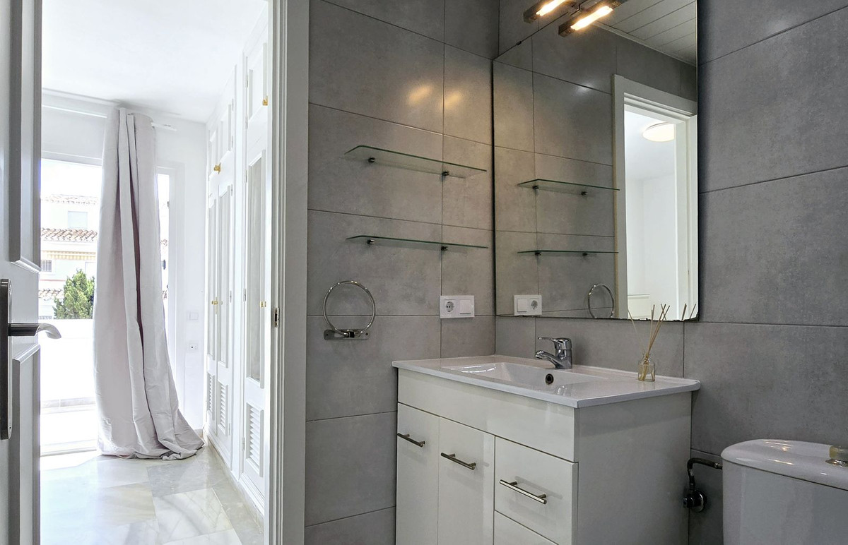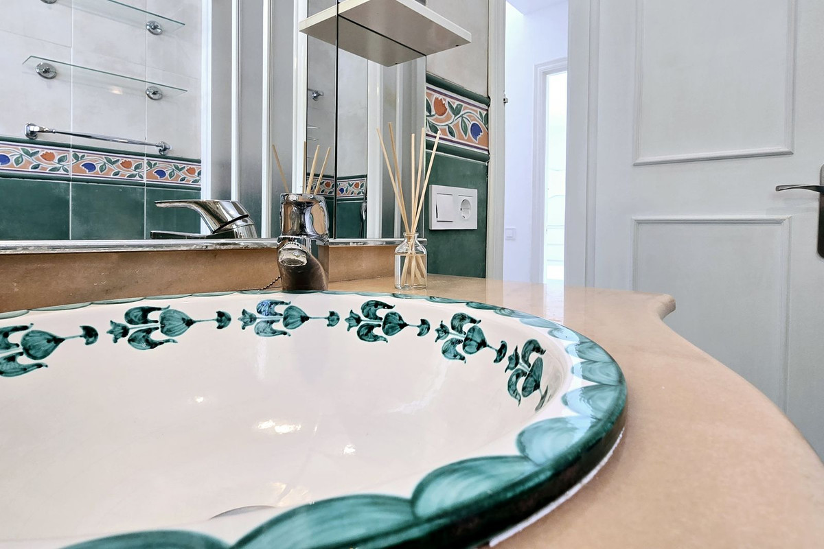 On the next level, we find the master bedroom en-suite, with its terrace, a large built-in wardrobe, and a newly renovated bathroom. On the other side of the staircase is the second bedroom, clear and bright with an ample built-in wardrobe, and a well-maintained bathroom nearby; both are very well-sized.