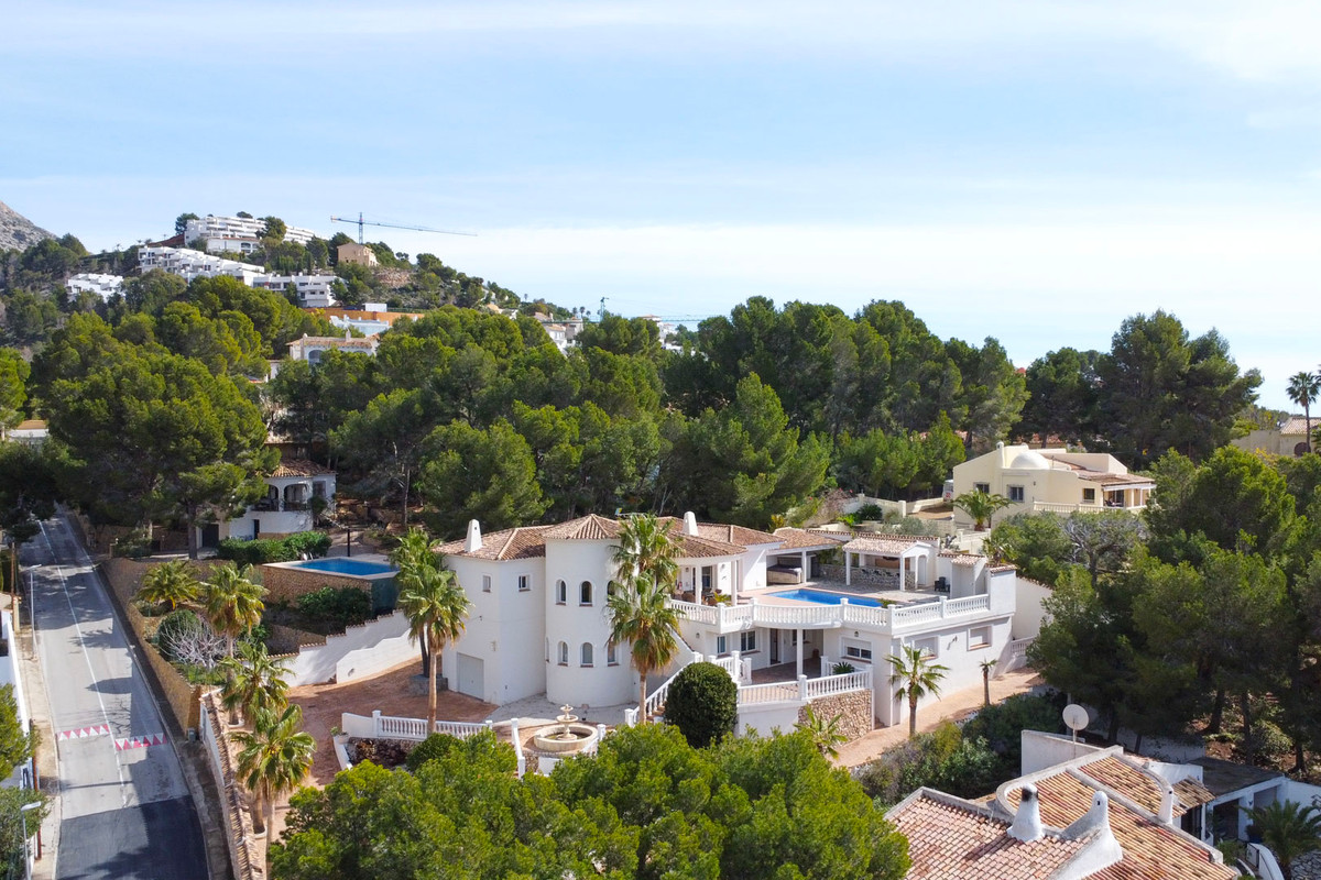 An automatic gate gives access to the property with the driveway immediately splitting into two to give you the choice of parking at the entrance to the main house or at the entrance to the guest house. If you park at the main house, stairs lead to the front door. You enter a stylish hallway with a spacious, fully equipped kitchen to the right. The hallway flows into the living-dining room where you will also find a small office. Through a corridor, where there is an additional bathroom, you reach the master bedroom with walk-in wardrobe and en-suite bathroom. You can enjoy beautiful views of the landscape from all rooms. From both the living room and the bedroom, there is direct access to the poolside terrace via sliding windows. There is also a covered terrace on this floor, an outdoor kitchen with a bar and an outdoor shower. The guest house comprises a kitchen, a dining area from where you can also enjoy the beautiful views of Sierra de Bernia, a lounge, a bedroom with an en suite bathroom and two bedrooms sharing a bathroom. Opposite the guest house is a large room of about 44 m2 with several windows, ideal to transform into an extra bedroom, gym or a cosy studio. The guest house and studio share a private terrace. The villa has air conditioning in all rooms, central heating via radiators, shutters and built-in wardrobes. There is also camera security consisting of several cameras and an alarm system. The villa is surrounded by a low-maintenance garden equipped with automatic irrigation. There is also a garage.