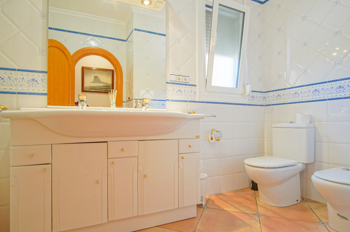 This fantastic villa is situated on a plot of up to 11,000 m2 and offers beautiful open views. The property consists of a very large villa consisting of three floors with the ground and second floor being a completely independent dwelling In addition, there is also a spacious guest house in the garden and a studio on the second floor. A very long driveway leads up to the villa. The first floor consists of a fully equipped kitchen with a storage room, a dining room with a stove, a large living room, three double bedrooms, two bathrooms and a storage room where all the facilities are installed for a sauna. In front of the first floor is a beautiful landscaped terrace. The second floor consists of a covered terrace, a spacious living-dining room, a kitchen, a laundry room, a double bedroom with an en suite bathroom and two double bedrooms with a shared bathroom. Also on this level is the 6 x 12 swimming pool with sun terrace and outdoor shower. By the pool is also a large outdoor kitchen with a covered terrace. On either side is an additional room with large windows that can be used as a lounge, office, utility room, gym, etc. There is also an outdoor bathroom. The pool and stairs are cordoned off with gates which makes it ideal for small children or pets. On the third floor is a spacious terrace and a separate apartment consisting of a kitchen with dining area, a double bedroom and a bathroom. Privately located in the beautiful Mediterranean garden about 100 m from the main house is a nice guest house consisting of a kitchen, a living-dining room, a double bedroom and a renovated bathroom. In addition, the villa has radiators, air conditioning, built-in wardrobes, awnings, shutters and connection to the electricity network. There is also a well that is functional. There is also a double garage, a single garage, a carport and a wine cellar. About 5500 m2 is fenced off and landscaped with palm trees, grass gardens and terraces. The remaining land of about 6000 m2 currently consists partly of orange trees and partly of tillable land. The size of the plot makes it ideal for those looking for a villa with space to keep animals. The villa has a rental license and is located in a rural area just 3 km from the coast of Benissa where you can find numerous idyllic coves. There are beautiful open views of the interior and the magnificent Sierra de Bernia. Both the center of Benissa and that of Moraira can be reached in 10 minutes. The center of Calpe can be reached in 15 minutes. Video available on request. Do not hesitate any longer and visit this fantastic villa!