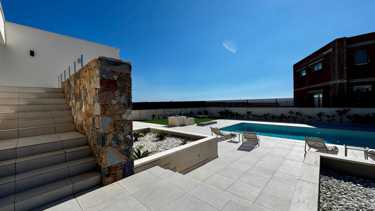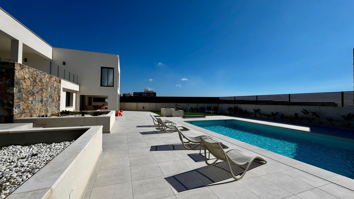 Step into luxury with this spectacular modern villa, located in one of the most prestigious and peaceful residential areas on the Costa Blanca. Designed with elegance, space, and Mediterranean lifestyle in mind, this stunning two-story home offers the ultimate comfort, privacy, and outdoor living.Set on a generous plot, the property boasts a sleek architectural design with clean lines, natural stone accents, and expansive windows that flood the interior with natural light. The beautifully landscaped garden features a lush green lawn, ideal for family activities, a mini football area, and multiple lounge zones. The highlight of the exterior is the sparkling private swimming pool surrounded by a sun-drenched terrace—perfect for relaxing, entertaining, or enjoying the sunny Spanish climate year-round. Inside, the villa features 5 spacious bedrooms and 3 elegant bathrooms, providing ample space for family and guests alike. The ground floor offers a bright, open-concept living area with modern finishes and direct access to the outdoor spaces, while the upper level enjoys tranquil views and large terrace—perfect for morning coffee or evening relaxation.The villa also includes a very large private garage, offering secure parking for multiple vehicles as well as generous storage space—an exceptional bonus rarely found in similar properties. The property has a high grade security system with motion detection and live/recording video feature which protects and monitors the inside and outside 24 hours a day, 7 days a week. The system is linked to local law enforcement and can be monitored via your smartphone or computer anywhere in the world, giving you peace of mind.Additional features include:- High-quality materials and finishes throughout - Air conditioning and climate control - Private onsite parking and gated access - Fully fenced plot offering privacy and security Located just minutes from the golden beaches of Orihuela Costa and the vibrant center of Torrevieja, this exquisite property is perfectly positioned close to international schools, golf courses, shopping centers, and fine dining—delivering a lifestyle of exclusivity, convenience, and relaxation.Whether you're searching for a luxurious permanent residence, a stylish holiday retreat, or a high-potential investment, this extraordinary villa offers a rare opportunity in one of the Costa Blanca's most coveted locations.