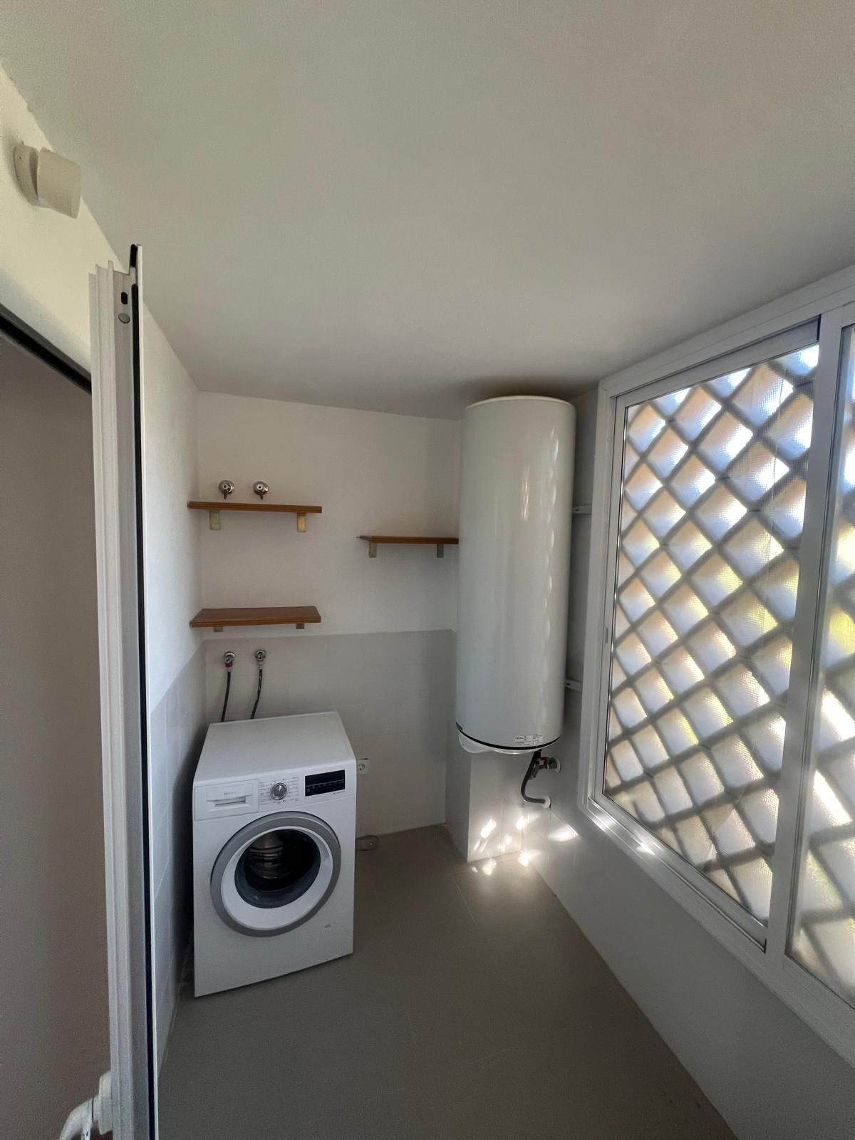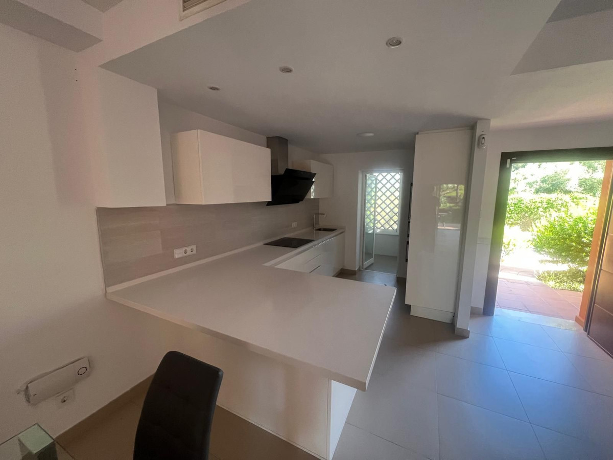 The south-facing living room on the ground floor opens onto a large private garden, which leads directly to the extensive communal gardens with a tropical pool area. The open-plan kitchen, fitted with top-range appliances, connects seamlessly to the dining and living areas, creating a spacious and luminous environment. This level also includes a guest bedroom with a bathroom.