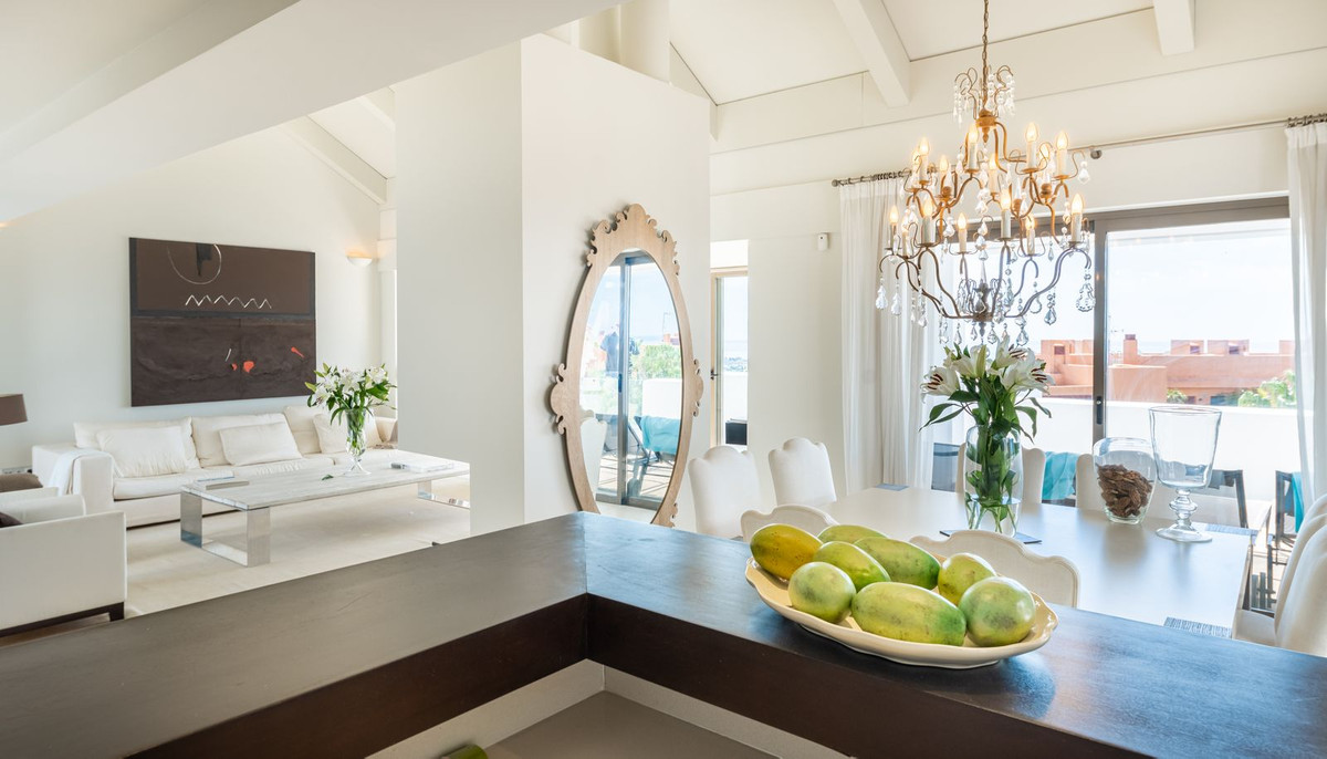 The luminious 212 m2 interior is surrounded by spacious; 95m2 terrace. The elegant living and dining area, featuring a contemporary fireplace, extends onto a vast terrace that captures breathtaking views stretching to Gibraltar—ideal for outdoor entertaining or serene relaxation.