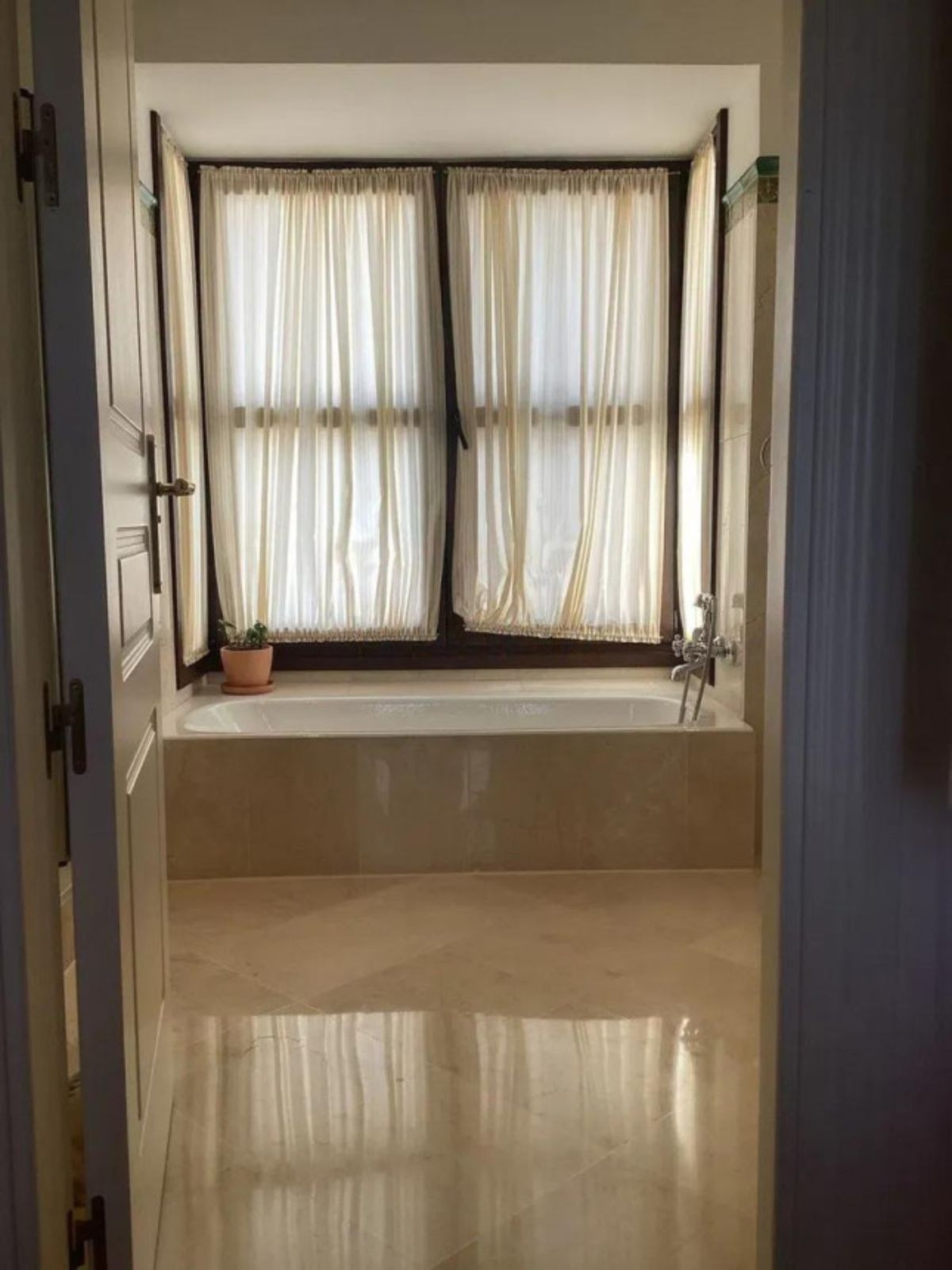 A spacious landing connects the two bedrooms, each with its own en-suite bathroom featuring both a bath and a shower. Both bedrooms include built-in wardrobes and Juliet balconies with spectacular views of the natural surroundings.