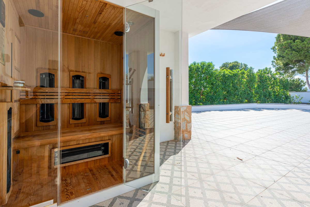 The villa enjoys a south-westerly orientation, maximizing natural light and offering breathtaking sunset views over the hills as well as towards the distant coastline.