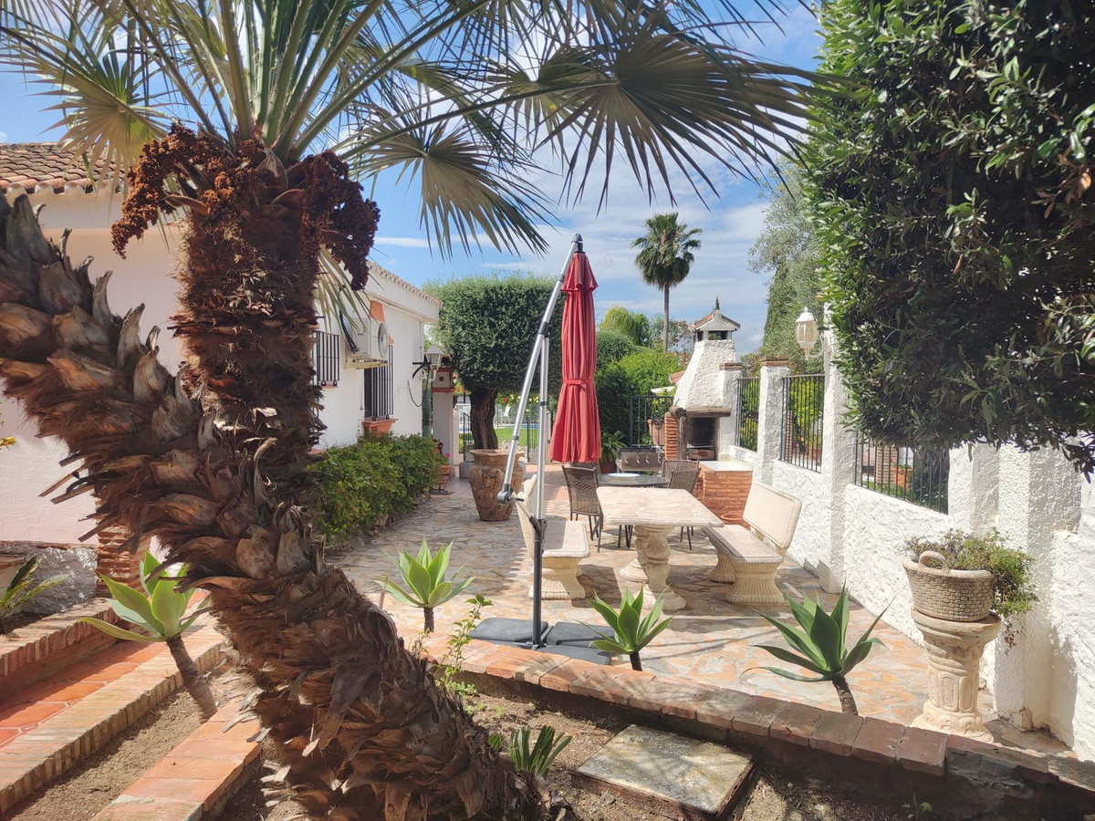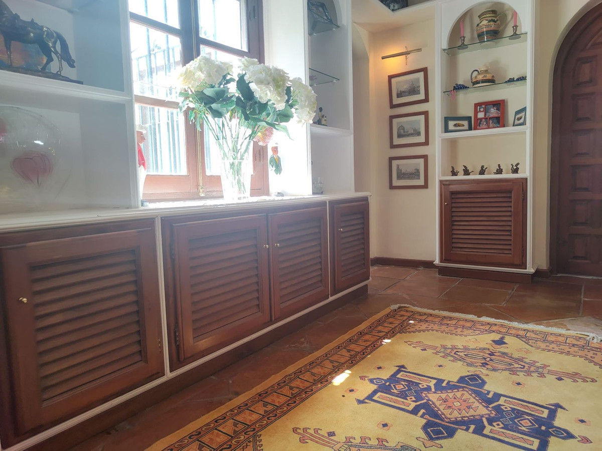 The main villa accommodates up to eight guests across three spacious en-suite bedrooms. Interiors are tastefully designed in a rustic-classical style, blending traditional charm with luxurious finishes. The elegant living and dining areas feature a large fireplace and expansive windows, flooding the space with natural light and framing beautiful garden views. A fully equipped kitchen opens onto an authentic Andalusian courtyard complete with a decorative fountain, offering a serene and stylish setting for private dining or quiet reflection.