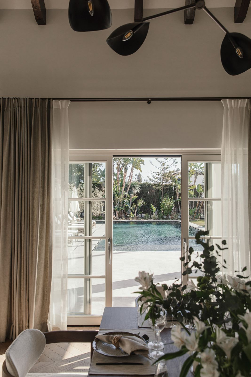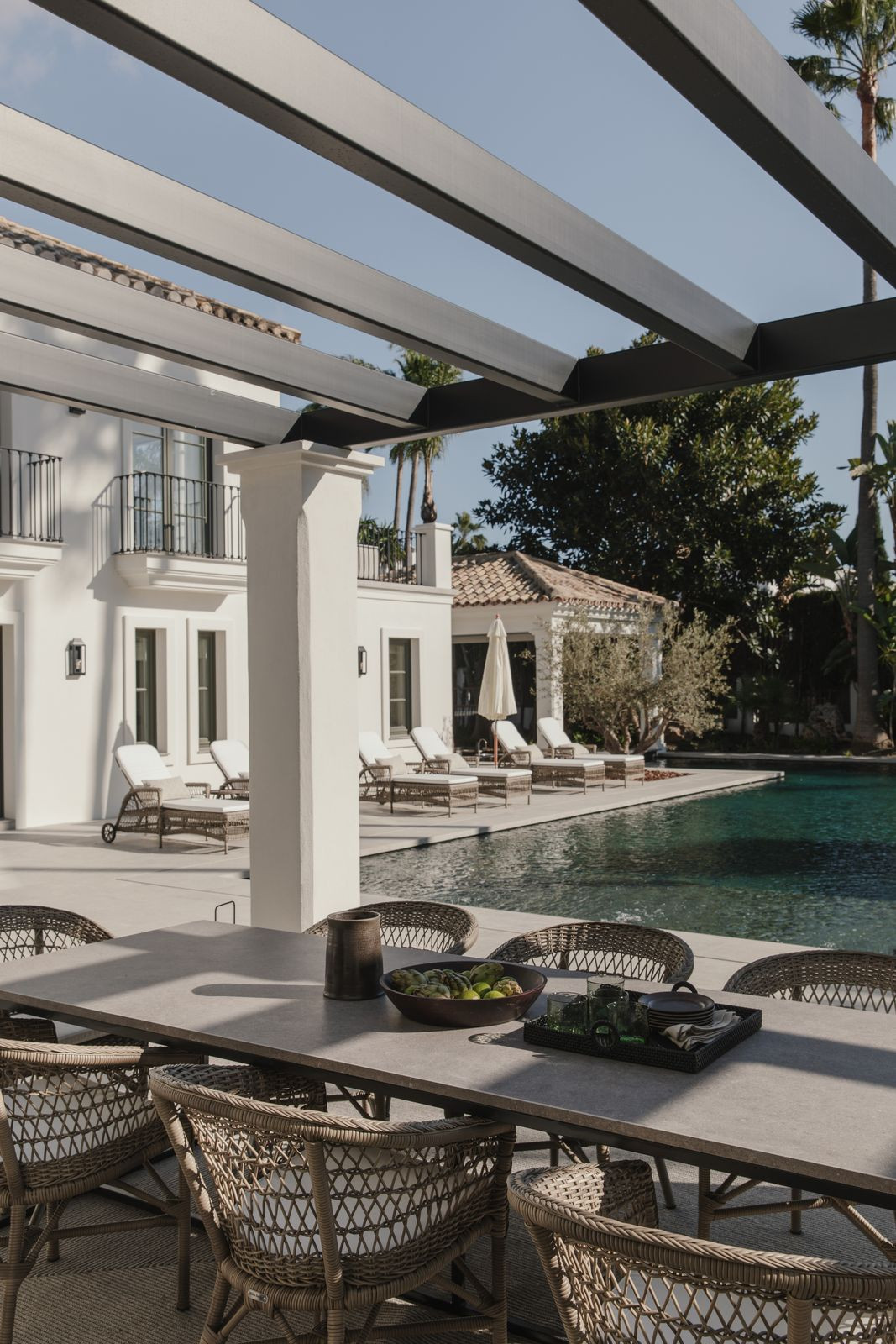 Recently built, the villa showcases outstanding craftsmanship and embraces a timeless French provincial aesthetic with elegant architectural features. Covered porches provide shaded lounge areas ideal for relaxing under the Mediterranean sun, while expansive terraces invite alfresco dining and laid-back social gatherings. A sunken chill-out area with a custom-designed bar beside the private pool creates the perfect setting for unforgettable summer evenings.