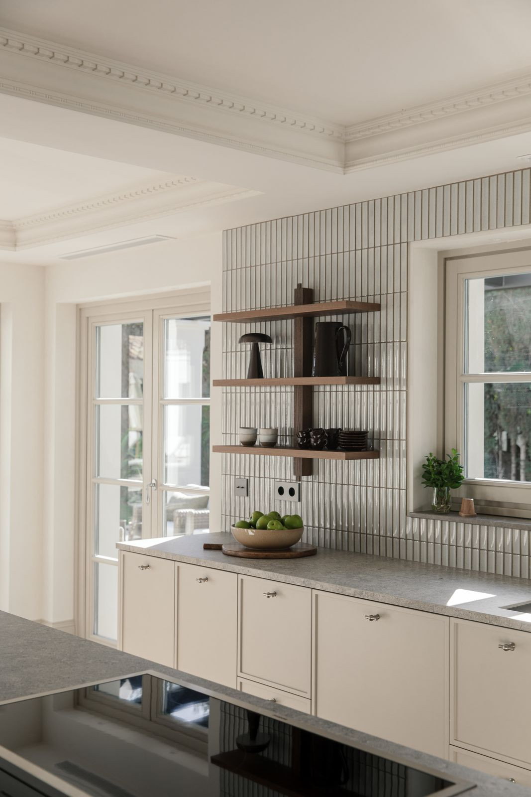 At the heart of the home is a beautifully tailored kitchen, marrying functionality with high-end design. The open-plan living and dining area is a masterclass in contemporary interior design, featuring curated furnishings, a soothing neutral palette, and warm wooden details. High ceilings and direct access to the terrace enhance the indoor-outdoor flow, infusing the space with natural light and an airy ambiance.