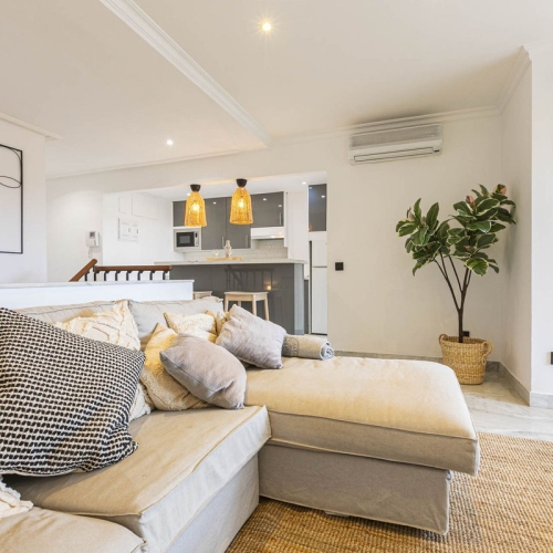 Welcome to this tastefully recently refurbished apartment in Placetes de Belvederes in Nueva Andalucia. As you enter you are greeted with a large open space with light and a feeling of a Loft Style property. All the materials have been carefully selected by the current owner and they have been put together tastefully such as the designer kitchen with Gaggenau appliances and the herring bone wooden floor from Denmark. The position of the property gives you the feel of a penthouse and you can enjoy fantastic sea and mountain views from the good size terrace. There is a good size parking place in the basement, buggy parking and a large storage. Well kept gardens, gym and pool are found in this boutique style development.