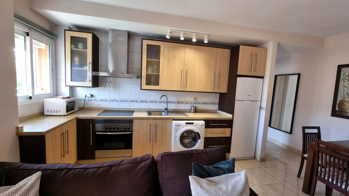 The apartment comes fully furnished and equipped, ready to move into or rent from day one. It features a communal pool, private parking space, and hot/cold air conditioning in the living-dining room and kitchen.
