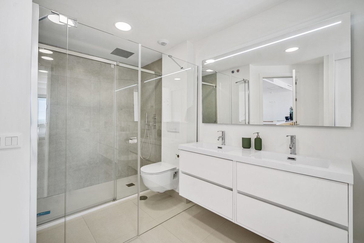 Upon entering this charming luxury apartment, you are greeted by a welcoming hall space, already showing seaview, that invites you to explore. To your right, a hallway takes you to a bathroom and two large double bedrooms, perfect for resting and relaxing. Both bedrooms have built-in wardrobes and have access to a large common terrace, ideal for enjoying the fresh air and views.