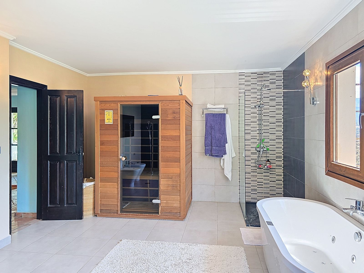 The first wing of the villa welcomes you with a spacious entrance hall, an attractive living room with fireplace that flows seamlessly into a spacious terrace - the perfect place to enjoy the breathtaking views. On the ground floor you will also find a spacious study with access to a bright conservatory room, ideal for those who want to work or read in peace. The modern kitchen opens onto a charming courtyard with a soothing fountain. On the first floor you will find three spacious bedrooms, including a lovely master bedroom with a luxurious bathroom with whirlpool and sauna and a private balcony where you can enjoy the enchanting view every morning. The two additional bedrooms share a second bathroom, ideal for guests or family members.