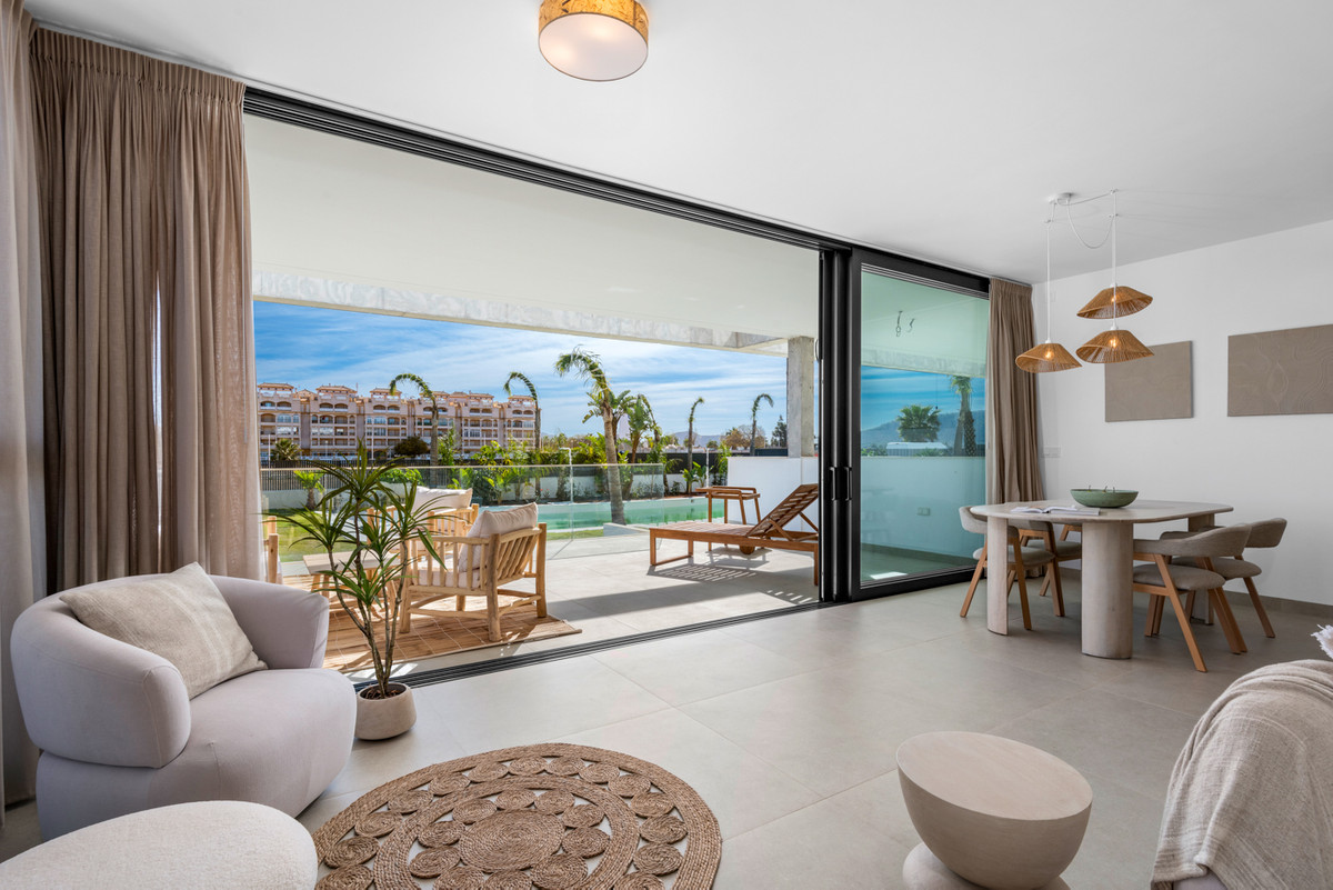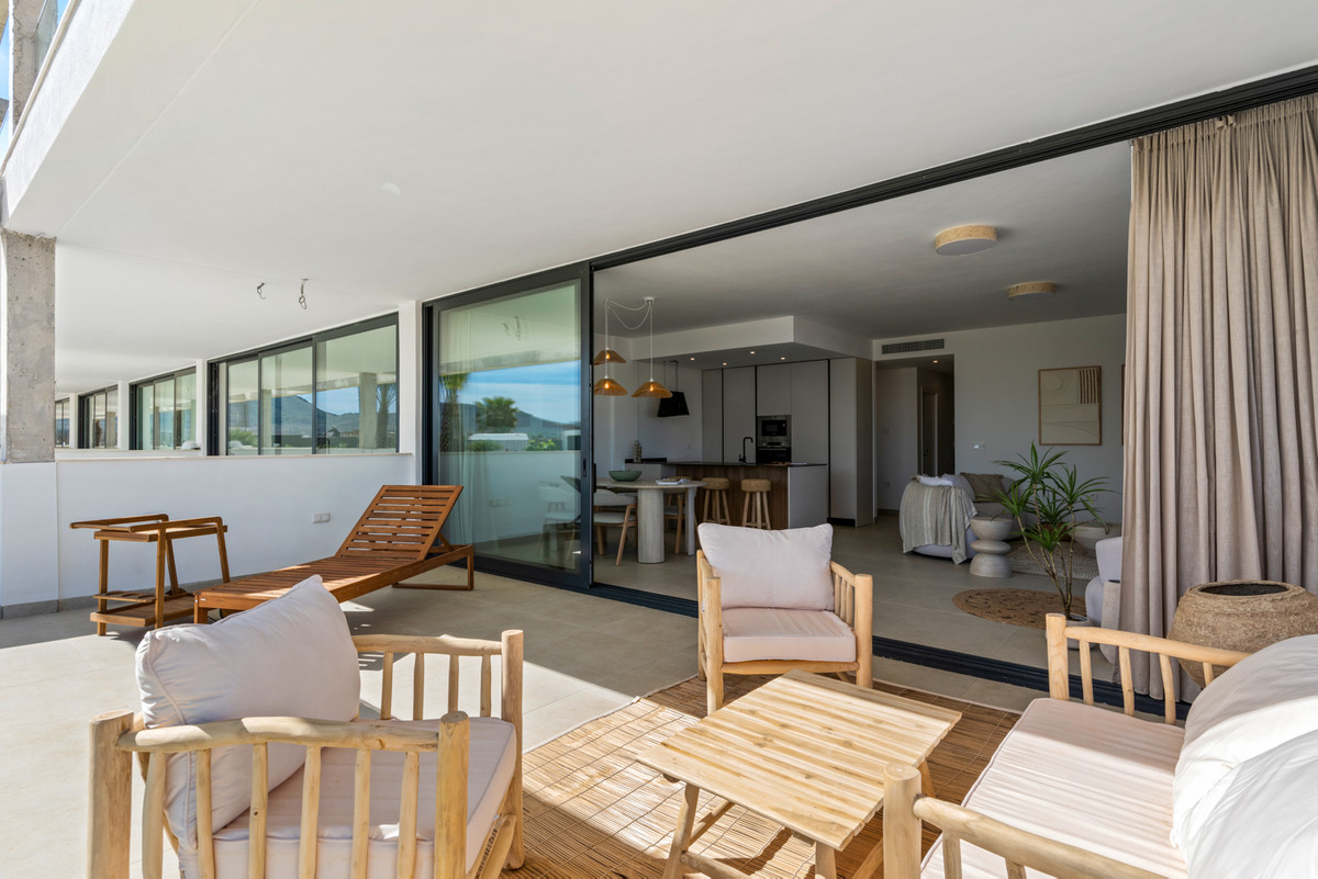 Modern style apartments, designed with open spaces and large windows, kitchen island, master bedroom with dressing room. Two bathrooms. The ground floors have big terraces facing to the pool whilst the phenthouse boast a solarium of more than 70m2. All homes are provided with a underground parking space for their vehicle and Storeroom.