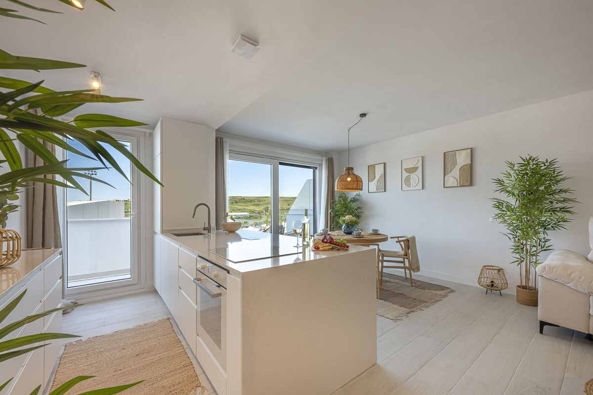 Clean lines, neutral colors and natural light define the open space of the living room, which flows onto a spacious terrace facing south-west, perfect for relaxing or partying with friends.
