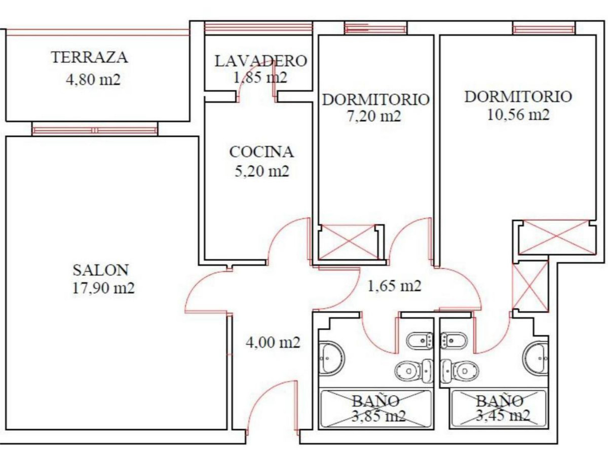 Second-floor apartment with elevator, two bedrooms, two bathrooms, living/dining room, kitchen, laundry room, and terrace. Private outdoor parking space and storage room.