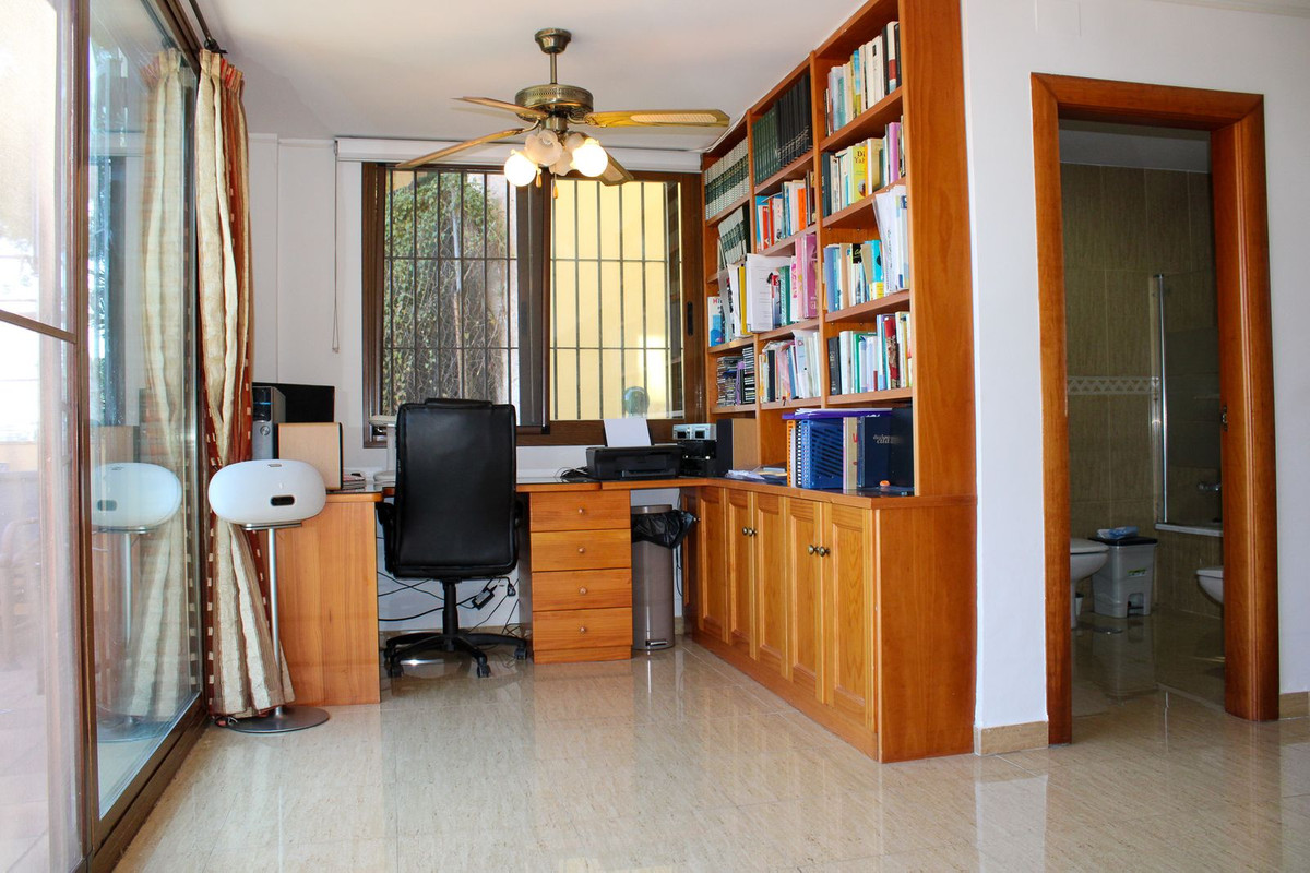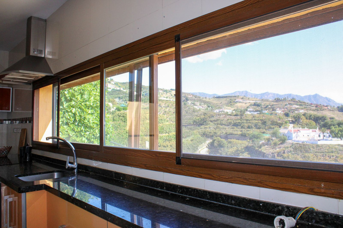 Adjacent to the living room we have a fully equipped kitchen, also with a lovely view of the mountains. From the kitchen there is also a staircase to the lower floor. Further on this floor we have a bathroom and a bedroom, this bedroom is currently used as an office.