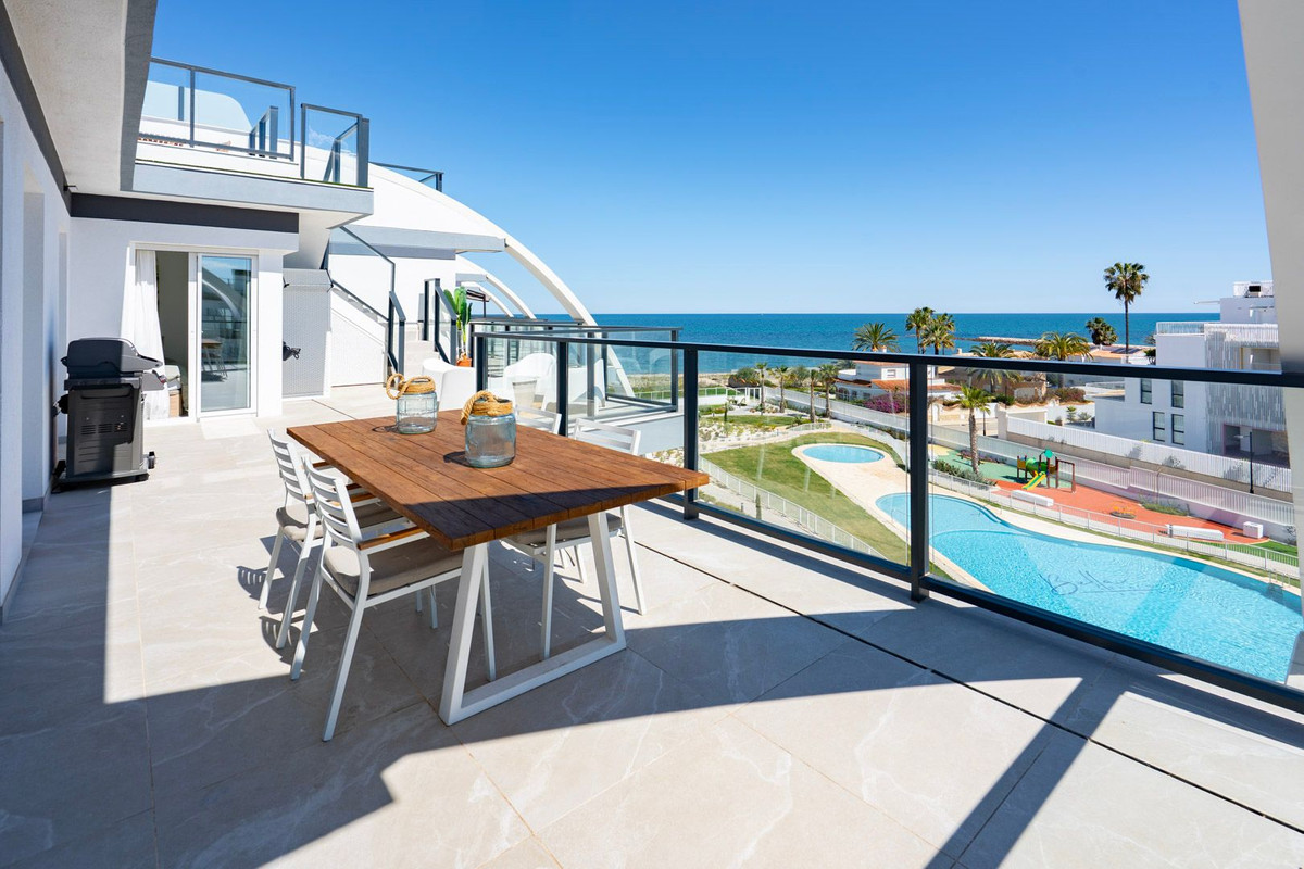 Fantastic luxury penthouse with panoramic sea views, located on the sandy beach of Playa de la Almadraba, in the modern Taylor Wimpey Bella Beach complex. This exclusive penthouse has stunning sea views from all rooms and also features a rooftop terrace of no less than 94.85 m2 where you can enjoy spectacular 360° views. To the east, the coastline stretches to Gandía, to the west the towers of the Montgó mountain, to the north you can see the sea directly, and to the south it overlooks the impressive Sierra de Segaria.