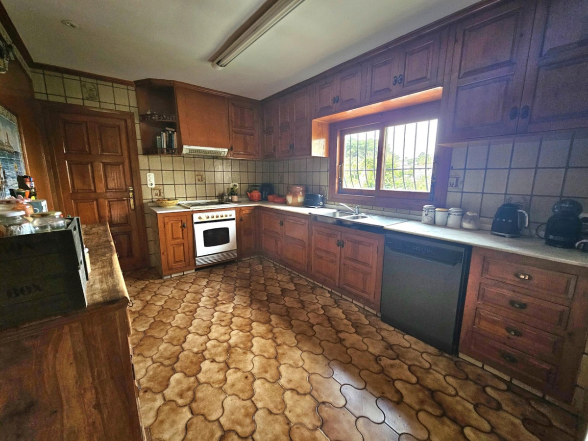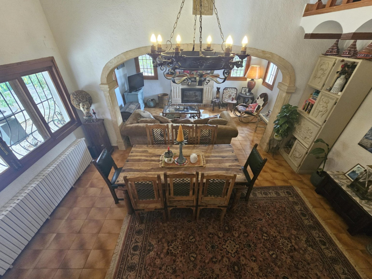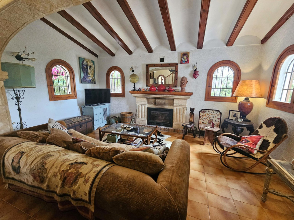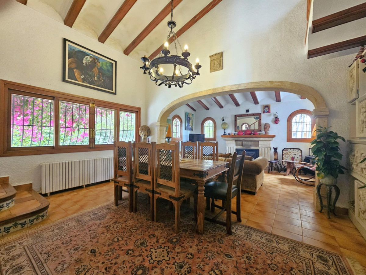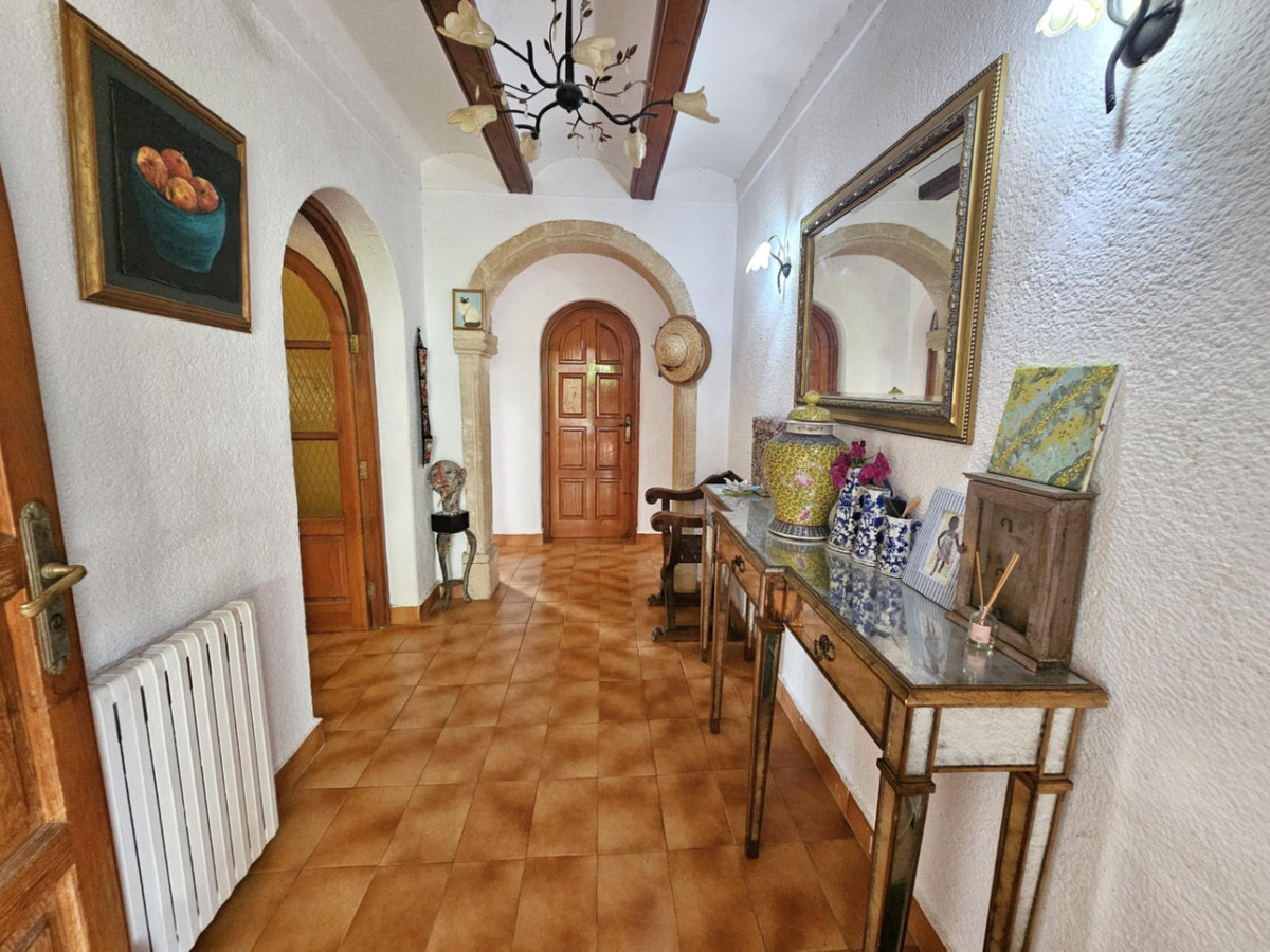 We present to you exclusively this beautiful traditional Villa in Jávea. Upon arriving at the property, we find a private parking area with sufficient space for four cars. Entering the Villa, we are welcomed by a hall that leads to a very spacious living-dining room, with the dining area featuring double-height ceilings. Passing through a beautiful Tosca stone archway, we enter the living room, which has a lovely wood-burning fireplace, also made of Tosca stone, making the space very cozy. The kitchen is a good size, with room for a table and chairs, and is equipped with many natural wood cabinets, providing plenty of storage space, along with a laundry room that makes daily life much easier. Additionally, on this floor, we have a full bathroom. On the upper floor, we find four double bedrooms, with built-in wardrobes and three bathrooms, two of which are en suite, as well as a spacious terrace from the master bedroom, with open views and a glimpse of the sea. The lower floor, accessible from an interior door, features a living-dining room with a small open kitchen, two bedrooms, a fully renovated full bathroom equipped with a shower, and another room that is currently used as storage but could be converted into a gym or another bedroom. The exterior of the Villa is a perfect place to enjoy the good weather, admire the views of Montgó, refresh ourselves in the 10x5 pool, sunbathe on the grass, or enjoy the spacious L-shaped naya with beautiful Tosca stone arches, reading a book, having dinner with family or friends, or simply sitting back and relaxing with a glass of wine. The entire Villa is equipped with diesel heating, wooden windows on the upper part, and tilt-and-turn double-glazed windows on the lower part.