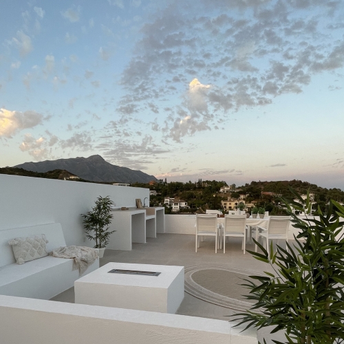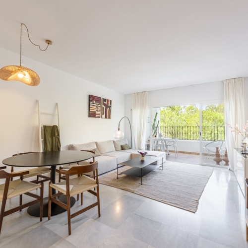 Inside, the apartment features an open-plan layout with a sleek modern kitchen, generous living and dining areas, and four well-appointed bedrooms—each with its own bathroom. Located in a secure, peaceful community, close to golf, nature, and a short drive from Marbella and Puerto Banús.