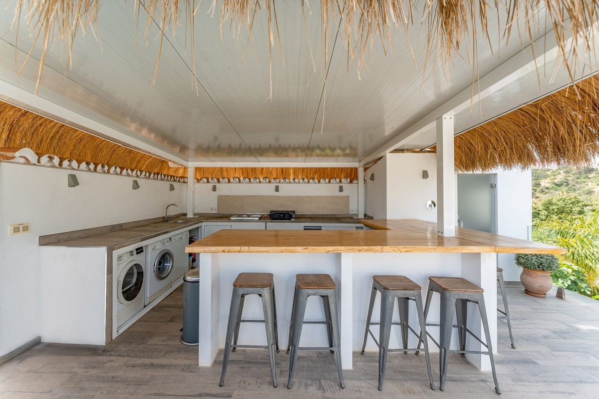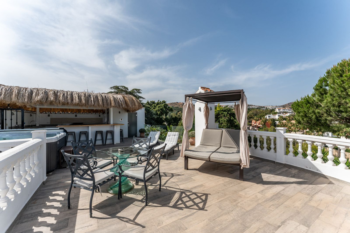 Stunning luxury villa located in the lower part of Calahonda, in an exclusive cul-de-sac surrounded by villas and in a very quiet residential area, just 800 meters from the beach, close to a beautiful natural green area of Calahonda, with breathtaking panoramic views of the sea and mountains. The property sits on a 715 m² plot and offers 232 m² of interior space plus a 70 m² terrace, fully enclosed, equipped with an alarm system and a private garage. The villa features four elegant bedrooms with king-size beds and en-suite bathrooms, marble floors throughout the house, double-glazed PVC windows and doors that provide exceptional natural light in every room. The furniture has been carefully selected and stands out for its sophisticated style and high quality. There are two dining areas — indoor and outdoor — perfect for entertaining. Outside, you'll find a large heated swimming pool with wooden decking, sun loungers, a chill-out area, and open views that invite absolute relaxation. On the rooftop, the spacious solarium offers a fully equipped bar, barbecue area, jacuzzi, and bar stools — ideal for enjoying unforgettable sunsets by the sea. Additionally, the villa holds a tourist rental license and is successfully rented most of the year, making it an excellent investment with high rental potential. A unique property that combines luxury, comfort, and a privileged natural setting on the Costa del Sol.