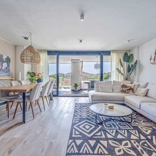 Enjoy your coming holidays in this contemporary ground floor apartment with a large private garden. Entering the apartment you have three bedrooms on the left of the hallway which leads you to the spacious living room with open plan kitchen, all beautifully decorated with furniture from the Netherlands. The wall to floor sliding terrace doors open up to a covered terrace and private garden. Complete with an underground parking spot and a very practical, spacious storage room at the entrance of the apartment. What makes this urbanization special is: heated pool, sauna, gym, laudry area, restaurant open all year, mini supermarket and concierge. Last but not least you can also enjoy the hotel style rental services offered on site.