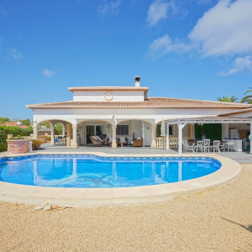 Villa die u koopt in Javea met panoramisch uitzicht. Op het gelijkvloers is er een eetkamer, een salon, een volledig conventionele keuken en 2 tweepersoonsslaapkamers met een en-suite badkamer, derde tweepersoonsslaapkamer bevindt zich in op de eerste verdieping, deze heeft ook een en-suite badkamer en een privé terras. Buiten is er een ruim zonneterras met zwembad en jacuzzi. Dit is een pre-installatie voor vloerverwarming in airconditioning voorzien.