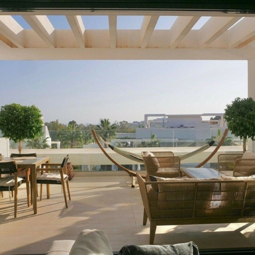 This beautiful apartment in El Lago, Los Arqueros, has an area of 178 square meters, of which 79 square meters are inside with an adjoining terrace of 20 square meters and a solarium of 79 square meters with kitchen, barbecue, 2 toldos, a sofa and a table with chairs. It has been completely renovated in 2025, including the windows with electric shutters. The kitchen + utility room and the 2 bathrooms are completely new, including plumbing and electricity. The new furniture is included, including a washer-dryer. A beautiful swimming pool with sunbeds 50 meters from your front door. In this apartment you can immediately enjoy your stay on the Costa del Sol. El Lago is located directly on the golf course of Los Arqueros and El Higueral. By car you are on the beach in 10 minutes, near San Pedro, Puerto Banús and Estepona. In 5 minutes you are in the beautiful village of Benehavis, full of atmosphere and coziness. don't miss this opportunity