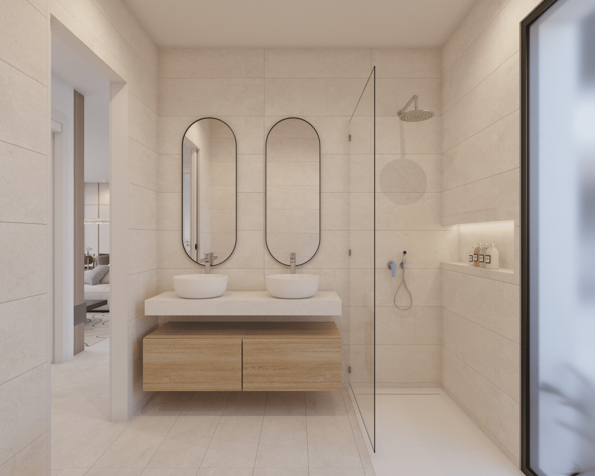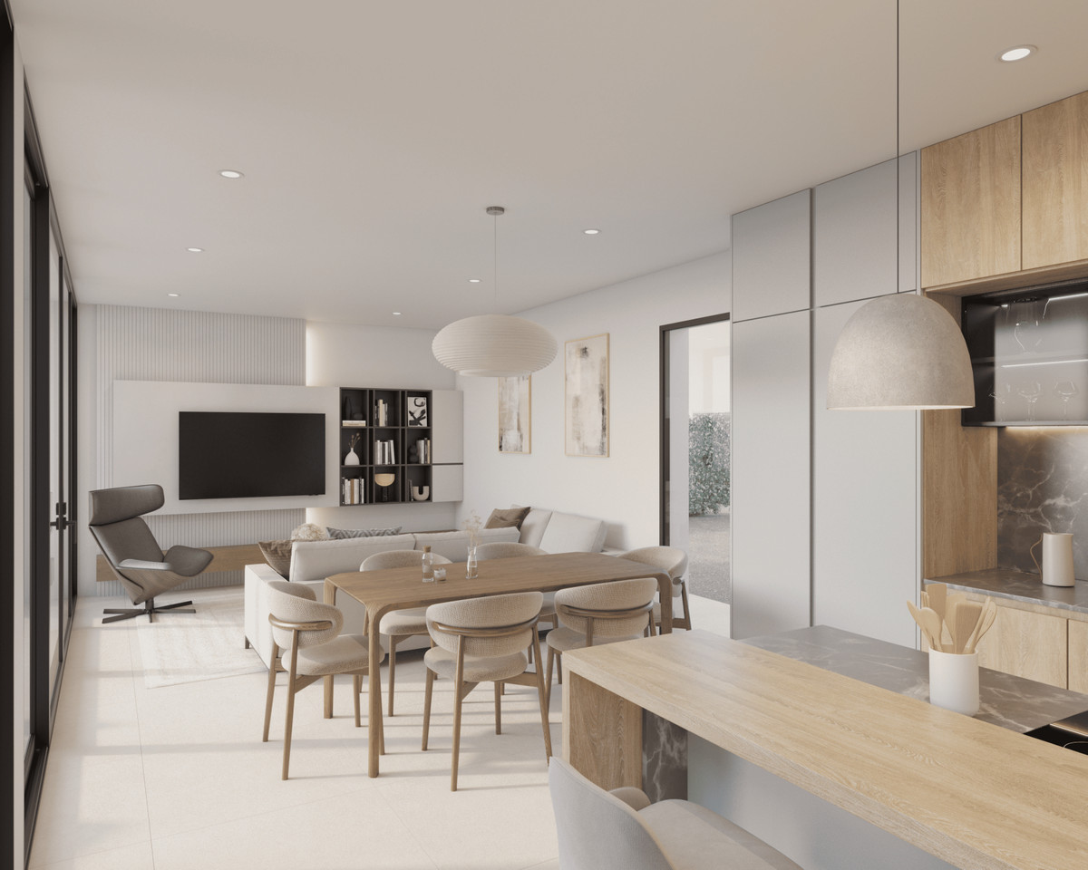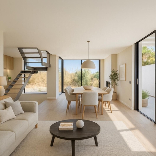 Villas with living-dining room-kitchen with island, 3 bedrooms and 3 bathrooms, dressing room and laundry room. Excellent quality and design. 162 m² of living space on plots between 700 and 1,000 m². Private swimming pool.