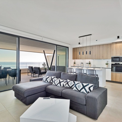 Practical layout: a spacious living-dining room with direct access to the main terrace, and a functional, well-equipped independent kitchen.