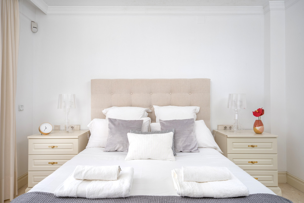 Excellent, fully renovated, three bedroom first floor apartment on Marbella's Golden Mile, in the sought after frontline beach community Las Cañas Beach, with 24hr security service, several communal swimming pools and tropical gardens. As well as being only a short walk to many bars, shops and restaurants. Casablanca Beach, one of the best on the coast, is just outside the front door. The apartment has a spacious open plan living and dining area with French doors leading out to the private terrace which is enclosed with glass curtians; fully fitted kitchen; master suite with access to the terrace; two guest bedrooms and a guest bathroom. Other features include hot and cold air conditioning, and fitted wardrobes.