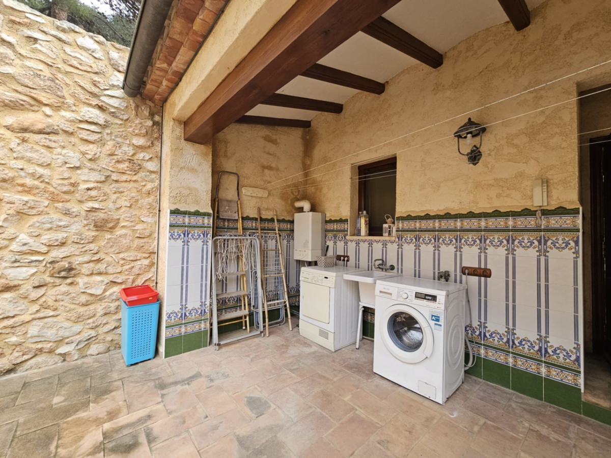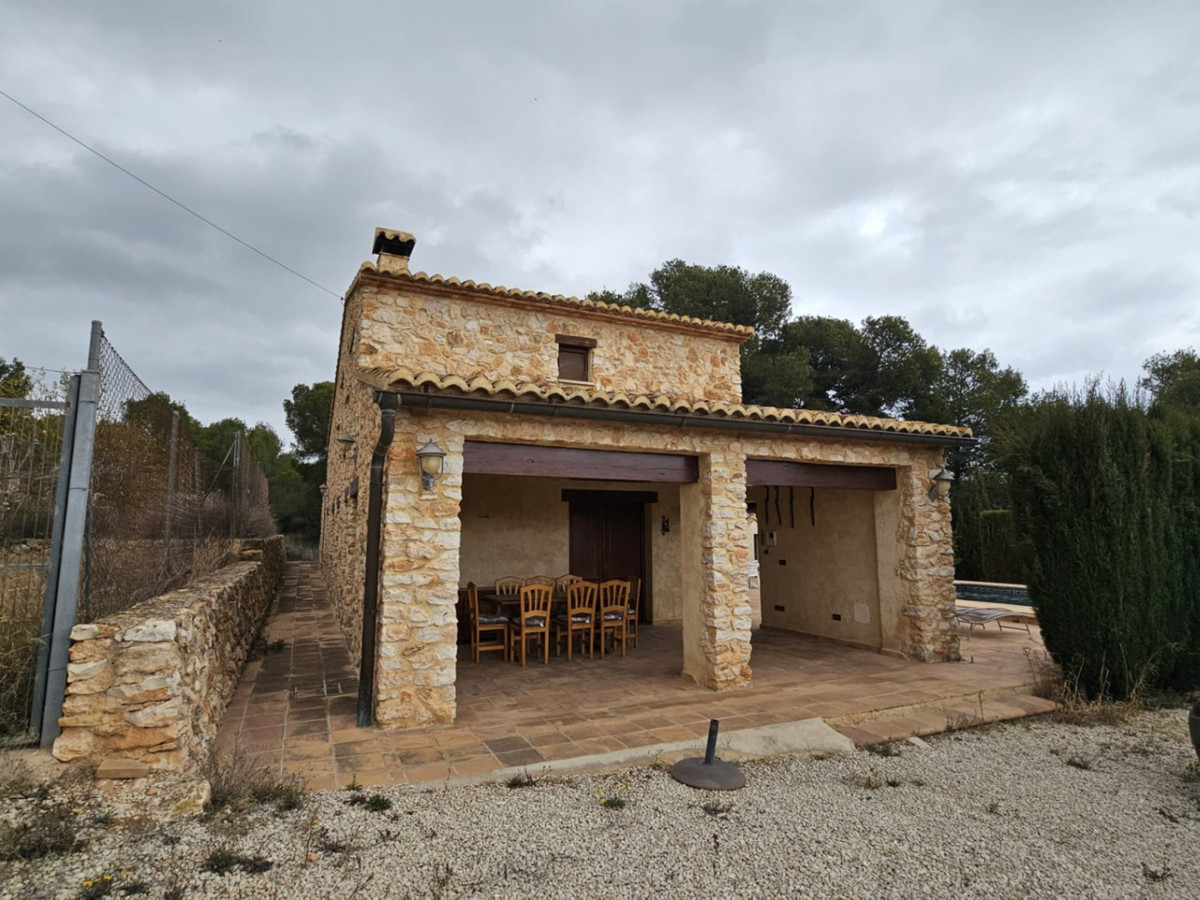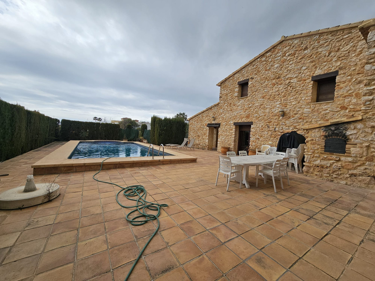 Welcome to this charming natural stone house, built in 1800 and renovated in 2002 with high-quality materials! Located on a 3,900 m² plot in Calpe, this estate offers a unique and character-filled environment, just 1 km from Arenal beach, about a 20-minute walk, and 400 meters from the Tennis Club. The south-facing orientation ensures light and sun all day long, creating a warm and welcoming space. Upon arrival, you can easily access through the electric sliding door or the pedestrian gate. You will find a covered garage with space for two cars, plus additional parking space outside. To the right, there is an old natural water well with its classic basin, ideal for those who appreciate traditional charm; it is currently not connected, but there is a possibility to connect it with a pump, and it is closed and fenced for greater security, separate from the house. The pool, pre-installed for heating, invites you to enjoy it at any time of the year. It also has an outdoor shower, a WC in a separate shed where the pool pump is located, and a storage room. The house has 4 bedrooms, all with heating/cooling air conditioning. On the ground floor, there is one bedroom, and on the upper floor, there are three more, two of which are connected by a door that leads to a shared room with double beds and a spacious storage room. The 3 bathrooms include one with a tub and the other two with showers. Central heating throughout the house, along with a safe system in one of the rooms, provide comfort and security. Notable features include built-in wardrobes with ample storage capacity, ceiling fans, shutters and mosquito nets on all windows, and Mobila wooden carpentry with nice views. The independent kitchen is fully equipped and has a separate pantry. The living room with a closed fireplace creates a warm and cozy atmosphere. Outside, you can enjoy an inner courtyard with a laundry area, perfect for relaxing with a coffee on windy days. The outdoor area also includes a barbecue, a birdhouse for bird lovers, a fenced area with a doghouse, and a covered porch that can be glazed, ideal for enjoying the landscape and the climate. Additionally, there is an original wood-fired oven, which adds a rustic and authentic touch. From the property, you can enjoy wonderful views of Calpe and the Peñón de Ifach, making this house truly special. Without a doubt, it is a home that combines history, comfort, and natural beauty, perfect for enjoying a comfortable and charming life. Don't hesitate to contact us to visit it!