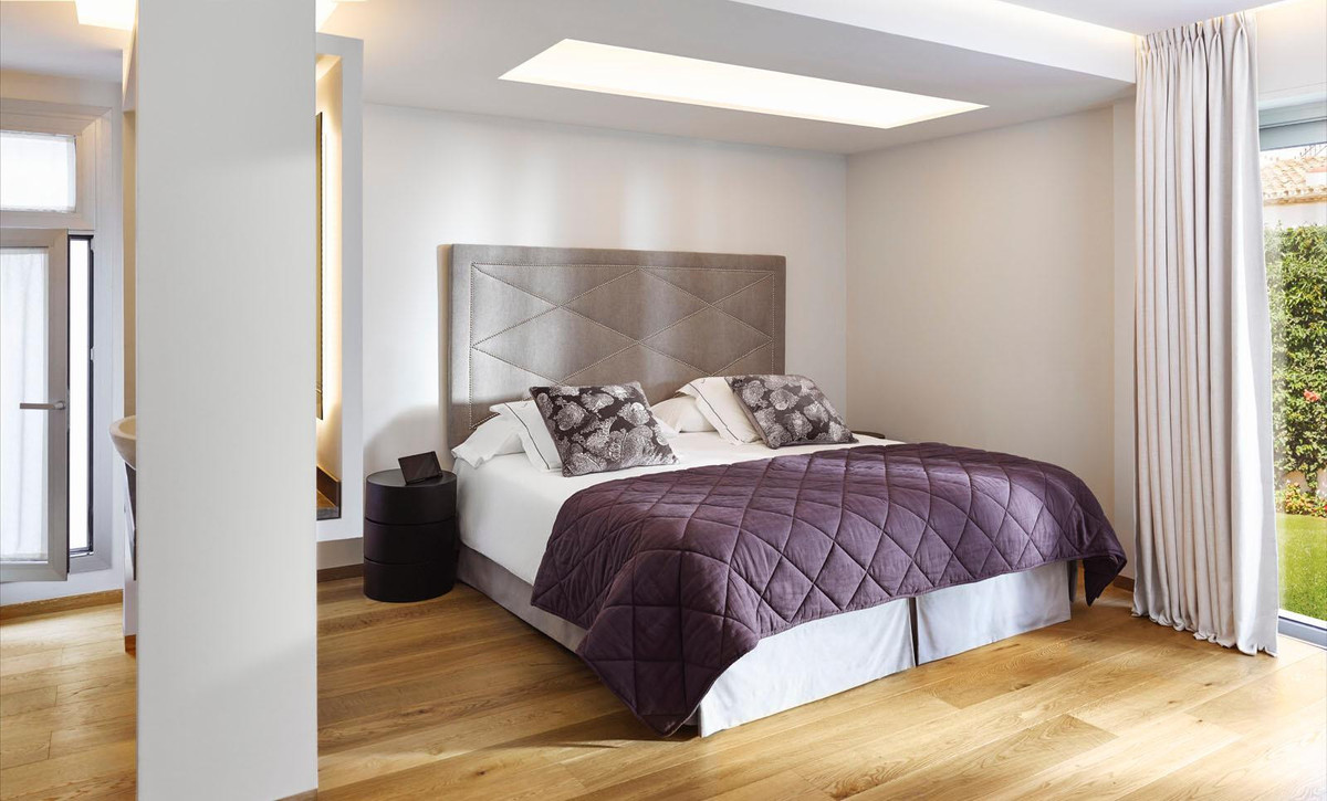 Contemporary 2nd line beach villa in Puente Romano, Golden Mile-Marbella. Built on 2 levels, this property comprises a good size open plan living/ dining room with integrated modern kitchen, fully equipped with top quality appliances and access to a south-facing terrace, garden, and pool. This level offers 2 bedroom suites, one of which with access to the garden. On the upper level there is the en-suite master bedroom with walk-in wardrobes and access to the terrace with breathtaking sea vies; as well as an additional en-suite double guest bedroom. The property is completed by a self contained en-suite bedroom on the ground level with separate access, ideal for staff or guests. Extra features include: under-floor heating throughout; A/C throughout; marble floors; good size swimming pool; alarm system, security blinds, wooden floors, etc.