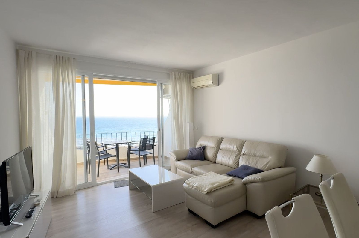 An entrance hall with a spacious bedroom on the first level, a full bathroom with another bedroom with sea views, and then a kitchenette in a comfortable and spacious open-plan living and dining area with direct access to the terrace.