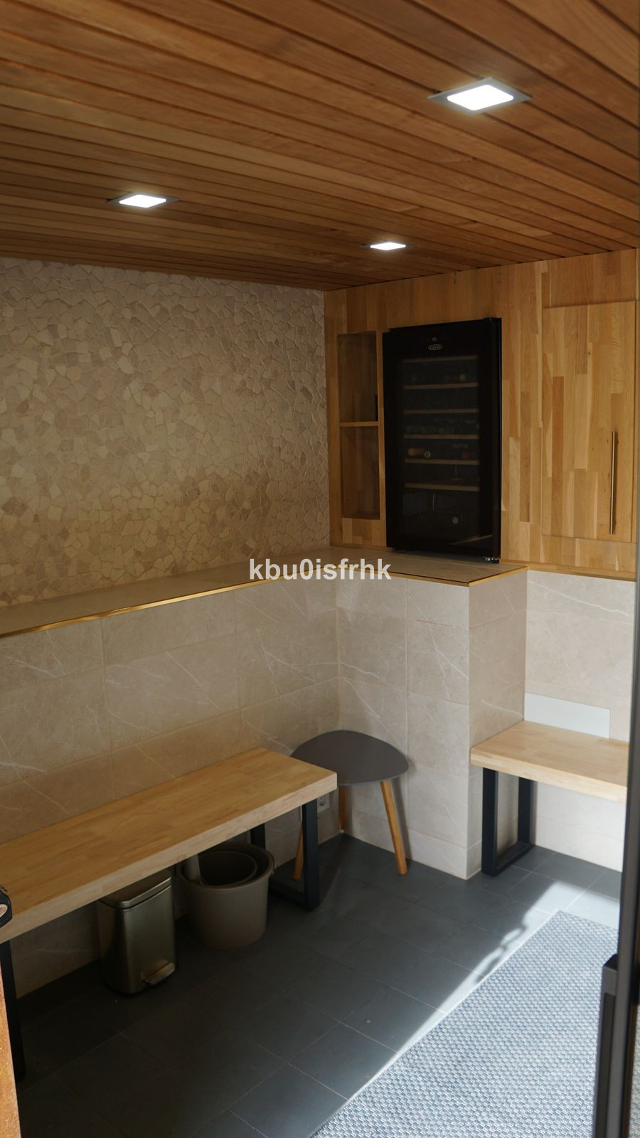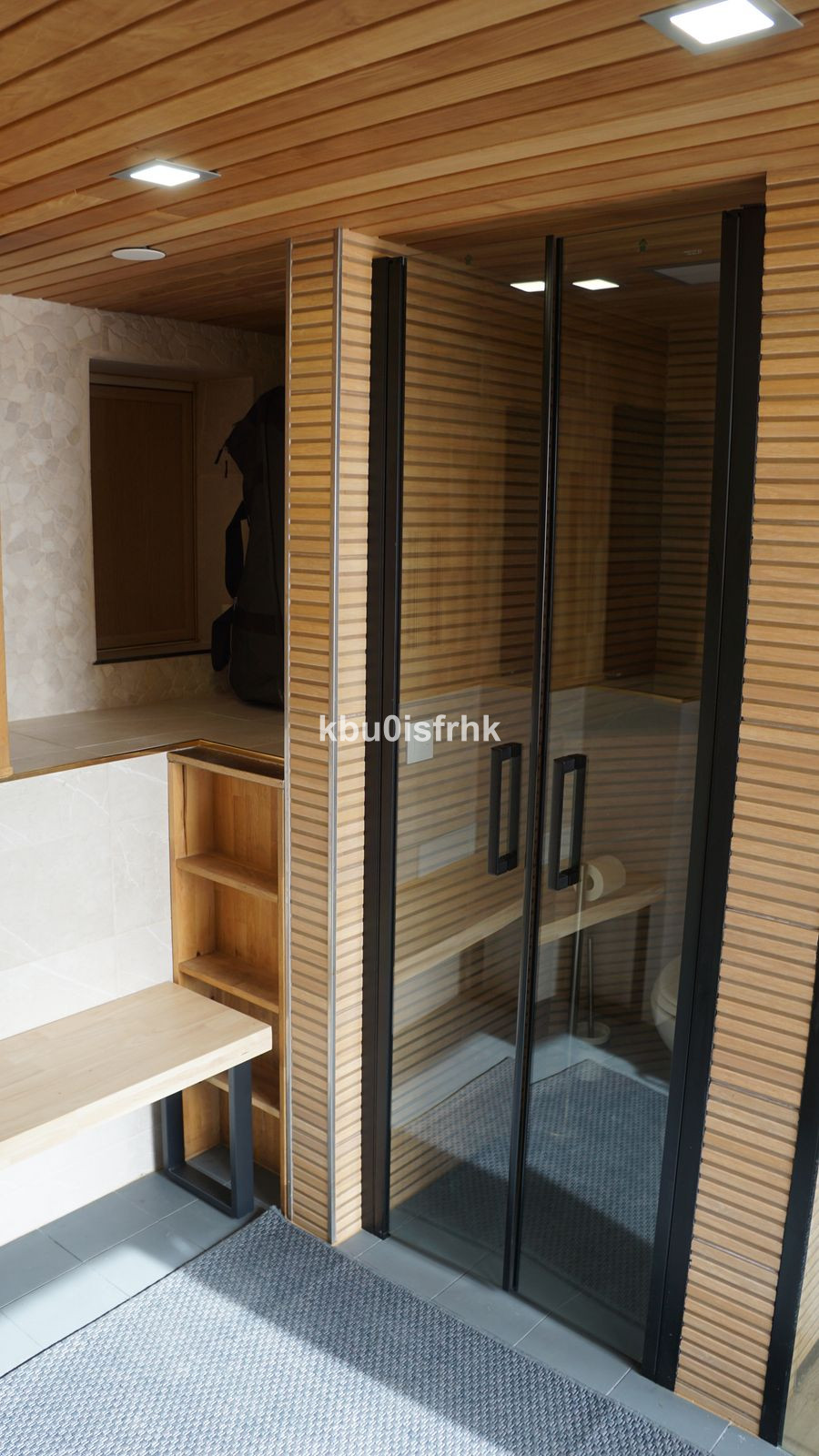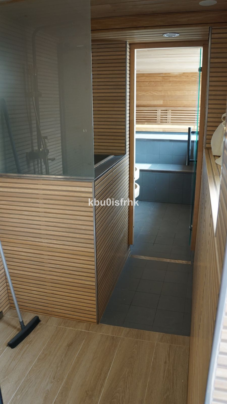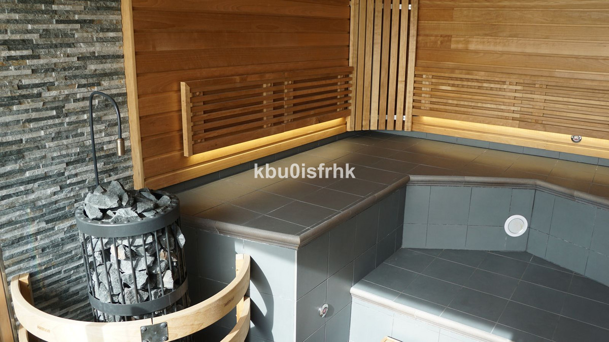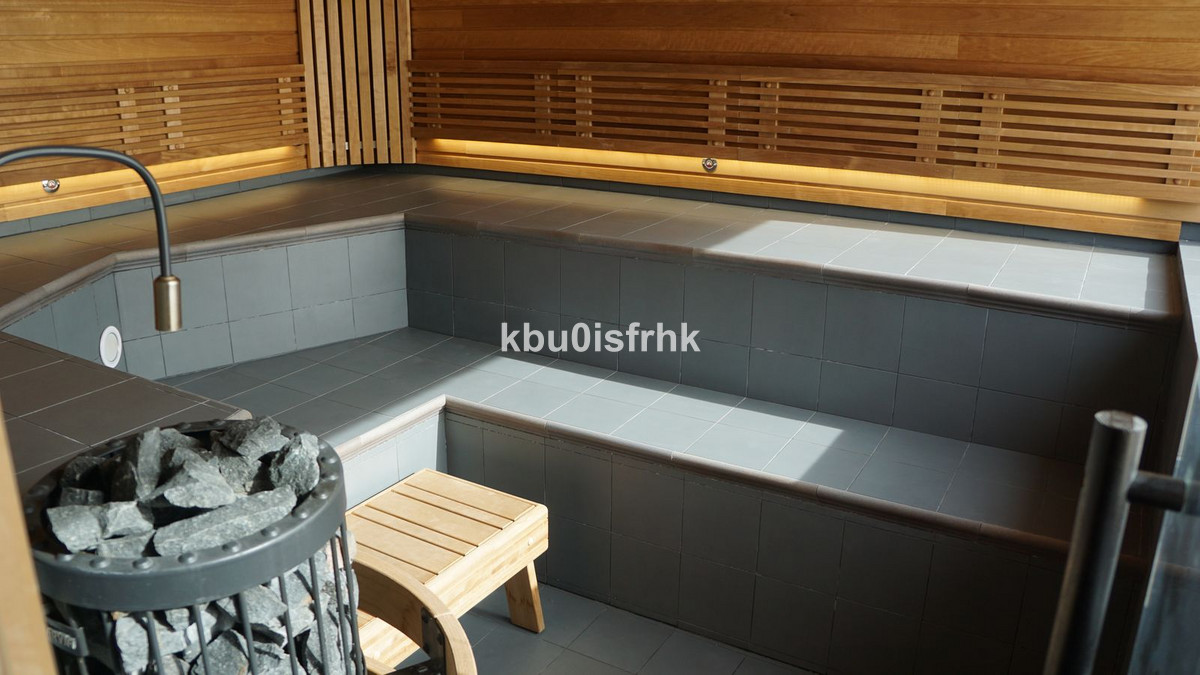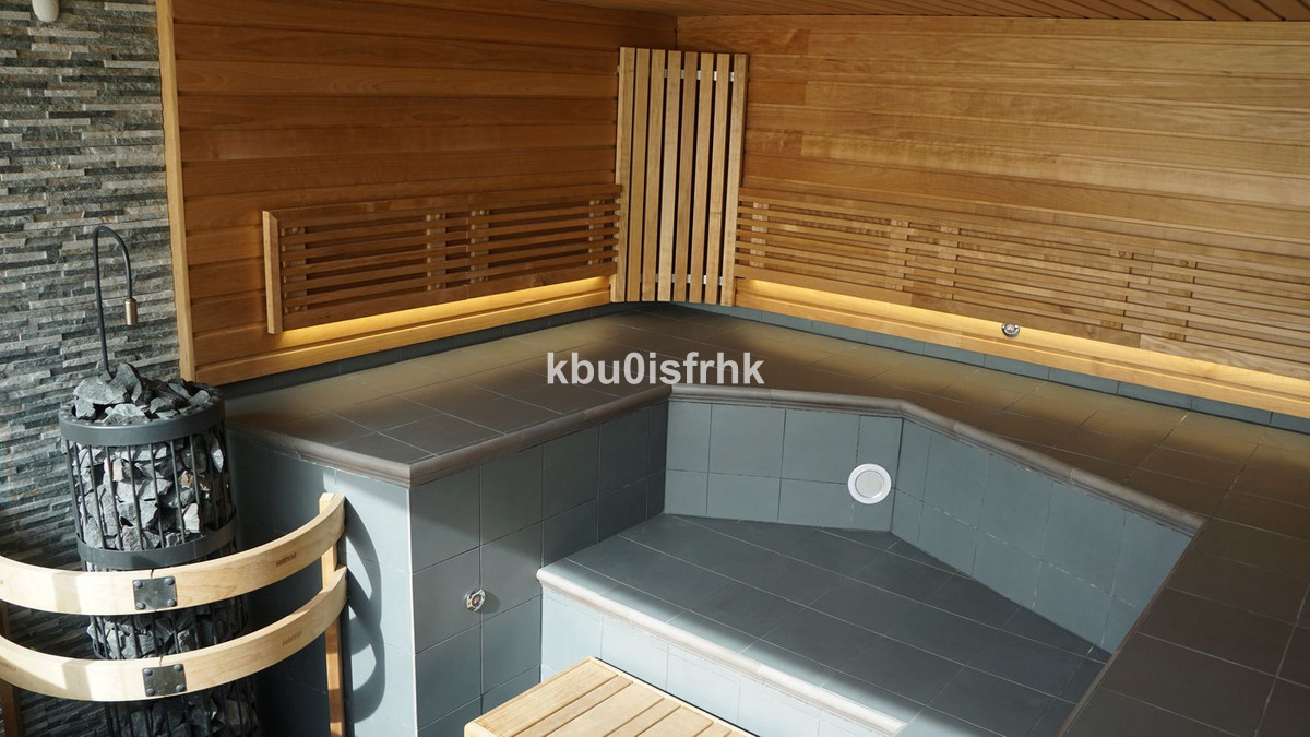 The home's layout includes a ground floor with a large Finnish sauna, a bathroom, and a mini kitchen. On the main floor, you'll find a bright living-dining area, a full-size kitchen, bathroom, two bedrooms, and a storage room. The second floor features two more bedrooms and two bathrooms with walk-in showers, and the top floor offers a stunning rooftop solarium with a shaded lookout.