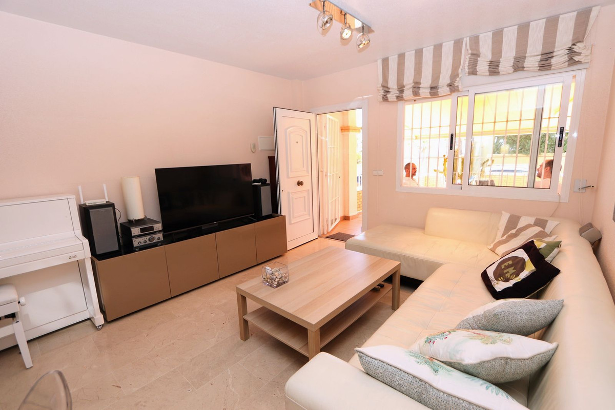 This property features three bedrooms, two bathrooms, a living/dining area, and a fully fitted kitchen with a utility area. It also has two terraces: a sunny front terrace with sea views and a rear terrace. Additionally, there's a basement/garage with space for at least two cars. The townhouse is within walking distance to all amenities and is being sold furnished.