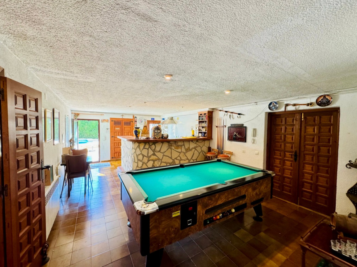 The ground floor offers even more living space, with an open kitchen and bar with pool table for entertaining evenings with friends or family. There are three large double bedrooms, each with its own ensuite bathroom and direct access to outdoor areas. In addition, the villa has a spacious garage with space for two cars and there is another separate room by the pool with built-in shower.