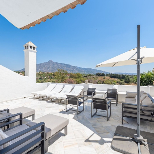Townhouse, located in Nueva Andalucía, is just a short walk from the beach in Puerto Banus and only a minute's drive from the shopping conveniences in Marbella. Situated in Altos del Rodeo, it offers exceptional potential, blending Marbella's classic Mediterranean style in a south and north facing property that is perfect for a full renovation. The property is also conveniently close to Puerto Banús, famous for its luxury boutiques and style-
