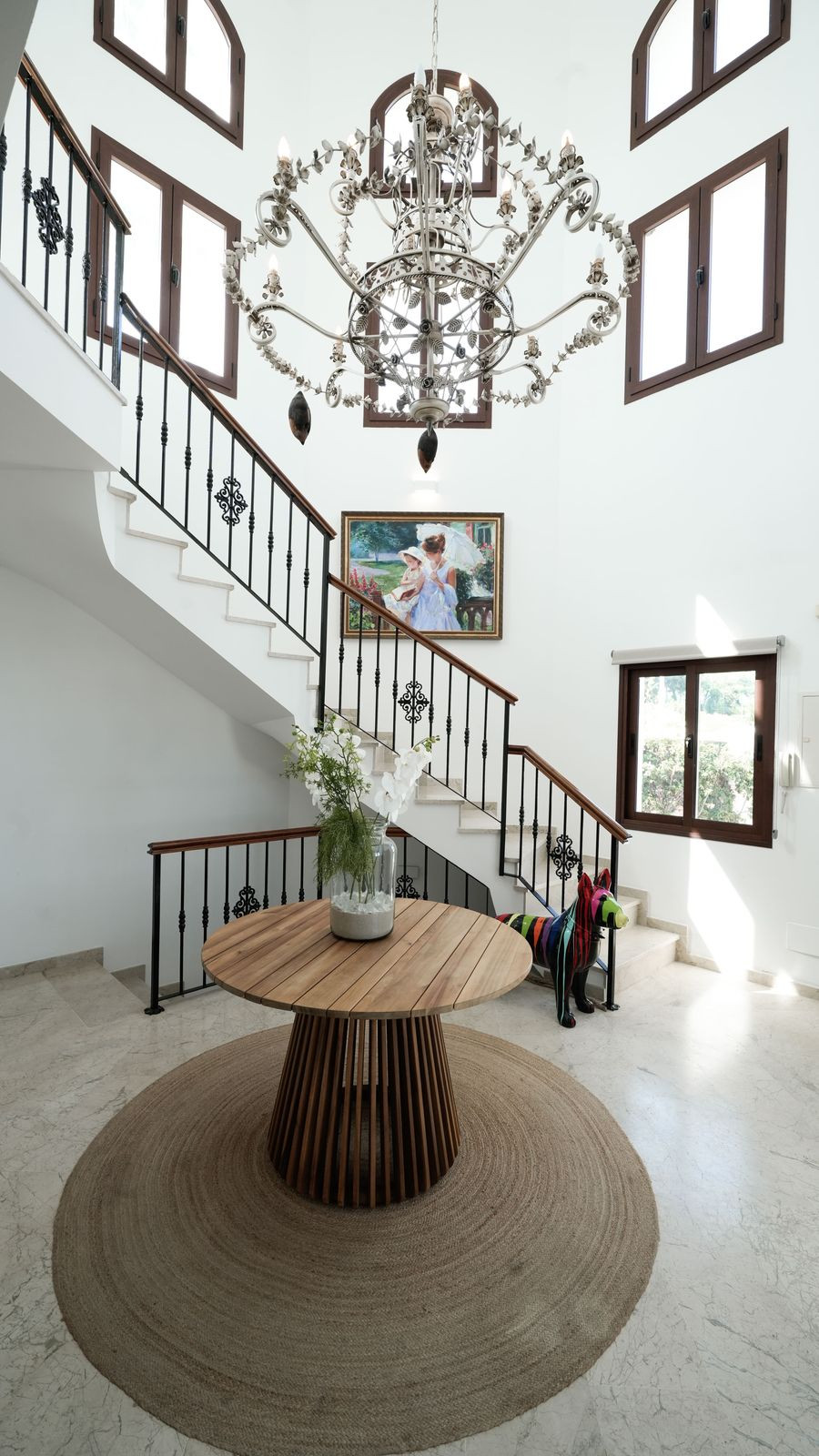 The ground floor features a bright and spacious living room, a large fully equipped kitchen, and an elegant entrance hall with a grand staircase. Two well-sized bedrooms are located on this level, along with two modern bathrooms and a guest toilet—making it ideal for guests or family members seeking ground-level convenience.