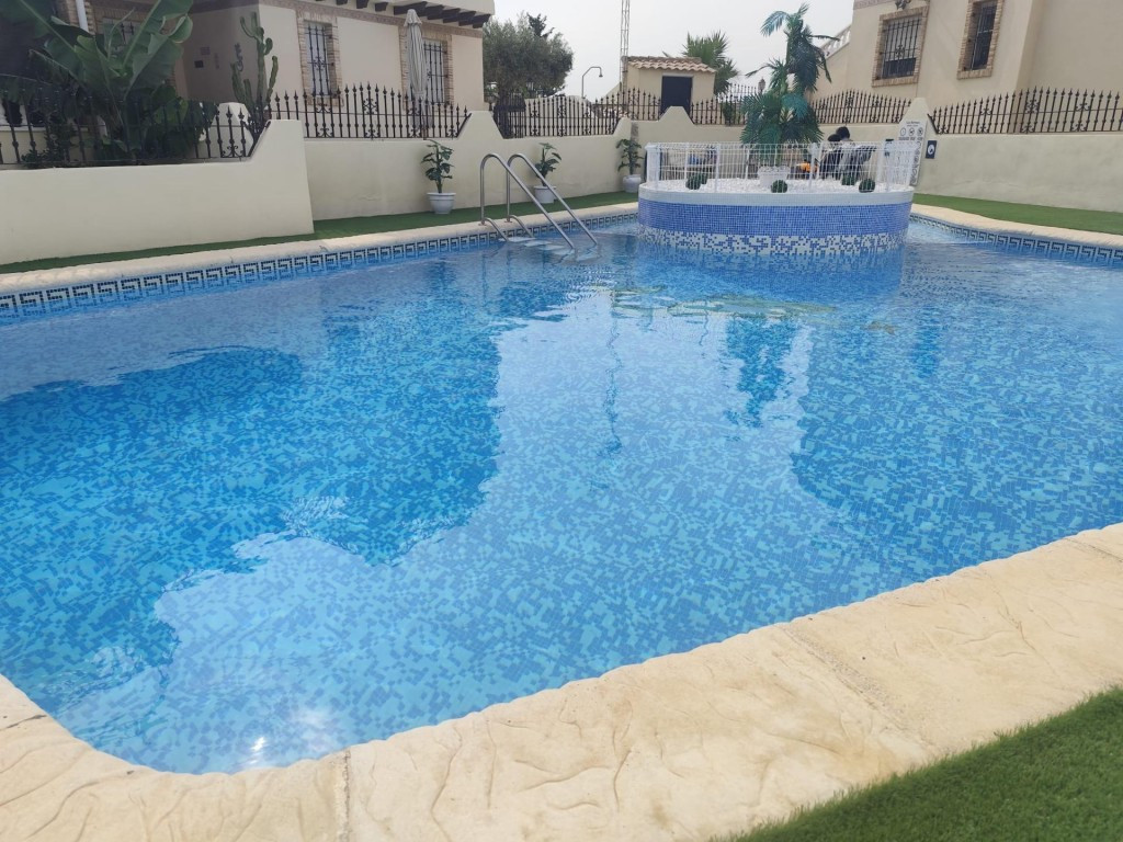 We present at the Costa Blanca Alicante a semi-detached house in Orihuela Costa  in a closed urbanization with swimmingpool! This house have 2 double bedrooms a bathroom, a toilet, and a equiped kitchen! Further a solarium and a garden! Close to the golf and center comercial!