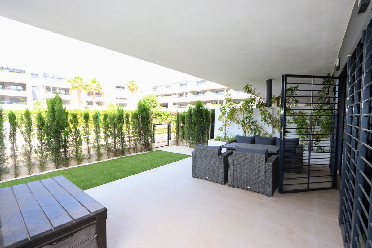 Welcome to Flamenca Village in Playa Flamenca a beautiful complex that offers you large parks, walking and cycling paths. Heated and unheated outdoor pools for both adults and children, Jacuzzis, parks and a water park for children, lakes and decorative fountains, a relaxing lounge with a dry bar and wet bar integrated into the pool, a pergola with terrace, a gym with a glass facade with a panoramic view of the lake and a Finnish sauna. This amazing Ground Floor Apartment consists of 3 bedrooms with fitted wardrobes, 2 bathrooms, living/dining area and a fully fitted kitchen with utility area. The property benefits from a large terrace, storage room, air conditioning, underfloor heating in the bathrooms, underground parking and is sold furnished