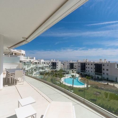 The bright and expansive living-dining area opens onto one of the two private terraces, perfect for enjoying the Mediterranean climate year-round. The apartment includes three bedrooms: the master suite features a walk-in wardrobe and en-suite bathroom, while the other two bedrooms have access to the rear terrace and come with fully fitted built-in wardrobes. There is also a second large, modern bathroom.