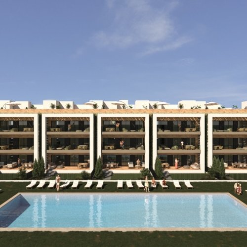 Modern style apartments, designed with open spaces and large windows, kitchen island, master bedroom with dressing room. Two bathrooms. The ground floors have big terraces facing to the pool whilst the phenthouse boast a solarium of more than 70m2. All homes are provided with a underground parking space for their vehicle and Storeroom.