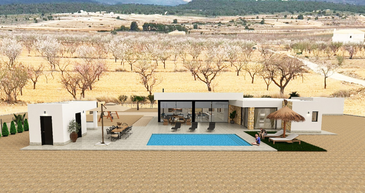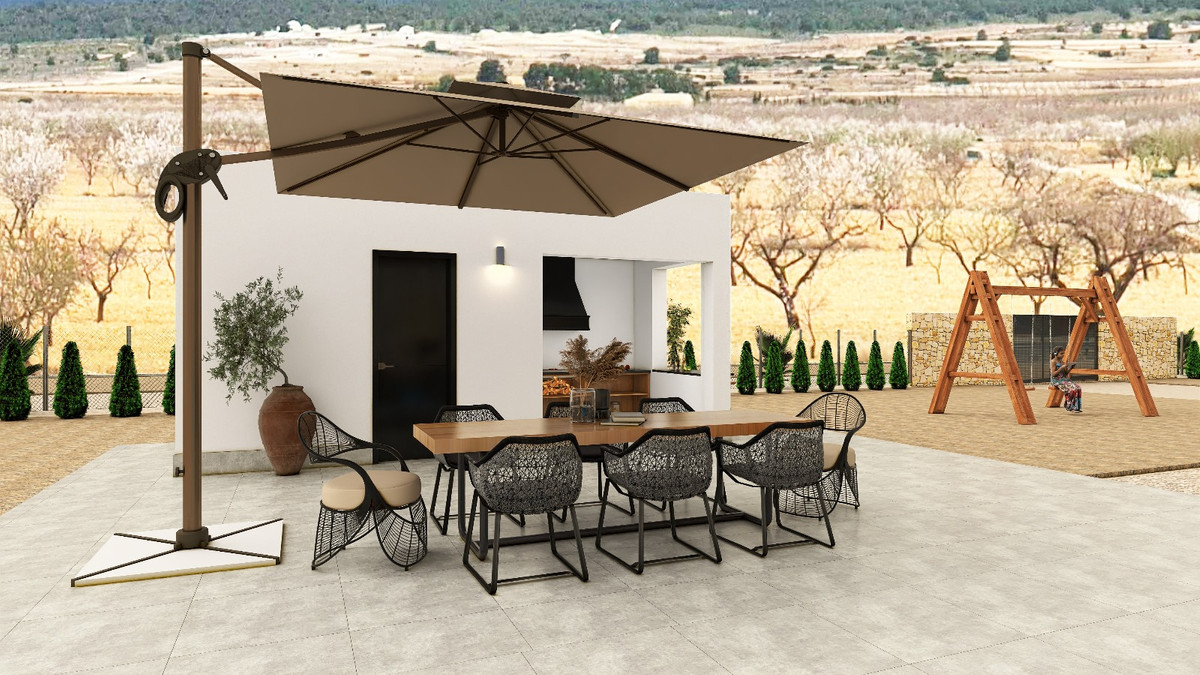 Equipped with a 8x4 swimming pool with an outdoor shower, porcelain perimeter around the pool, pre-installation for heating, barbecue area with toilet facilities, enclosed garage with an automatic door and included motor, pre-installation for an electric charging point, landscaped area with artificial turf, motorized automatic access gate to the plot (including motor), and a natural stone-clad wall.