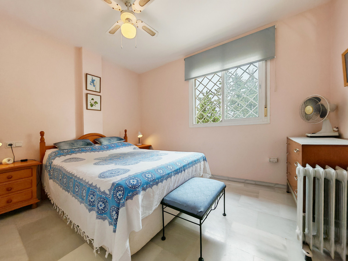 Apartment for sale in Elviria, Marbella with 3 bedrooms, 2 bathrooms and 1 on suite bathroom, with communal swimming pool, private garage and communal garden. Regarding property dimensions, it has 128 m² built, 108 m² interior and 20 m² terrace. Has the following facilities amenities near, transport near, air conditioning, fully fitted kitchen, marble floors, storage room, private terrace, kitchen equipped, sea view, internet - wi-fi, gated community, pool view, beach side, close to children playground, close to sea / beach, uncovered terrace, good condition, ceiling cooling system, ceiling heating system, close to shops, close to town, close to schools and surveillance cameras.