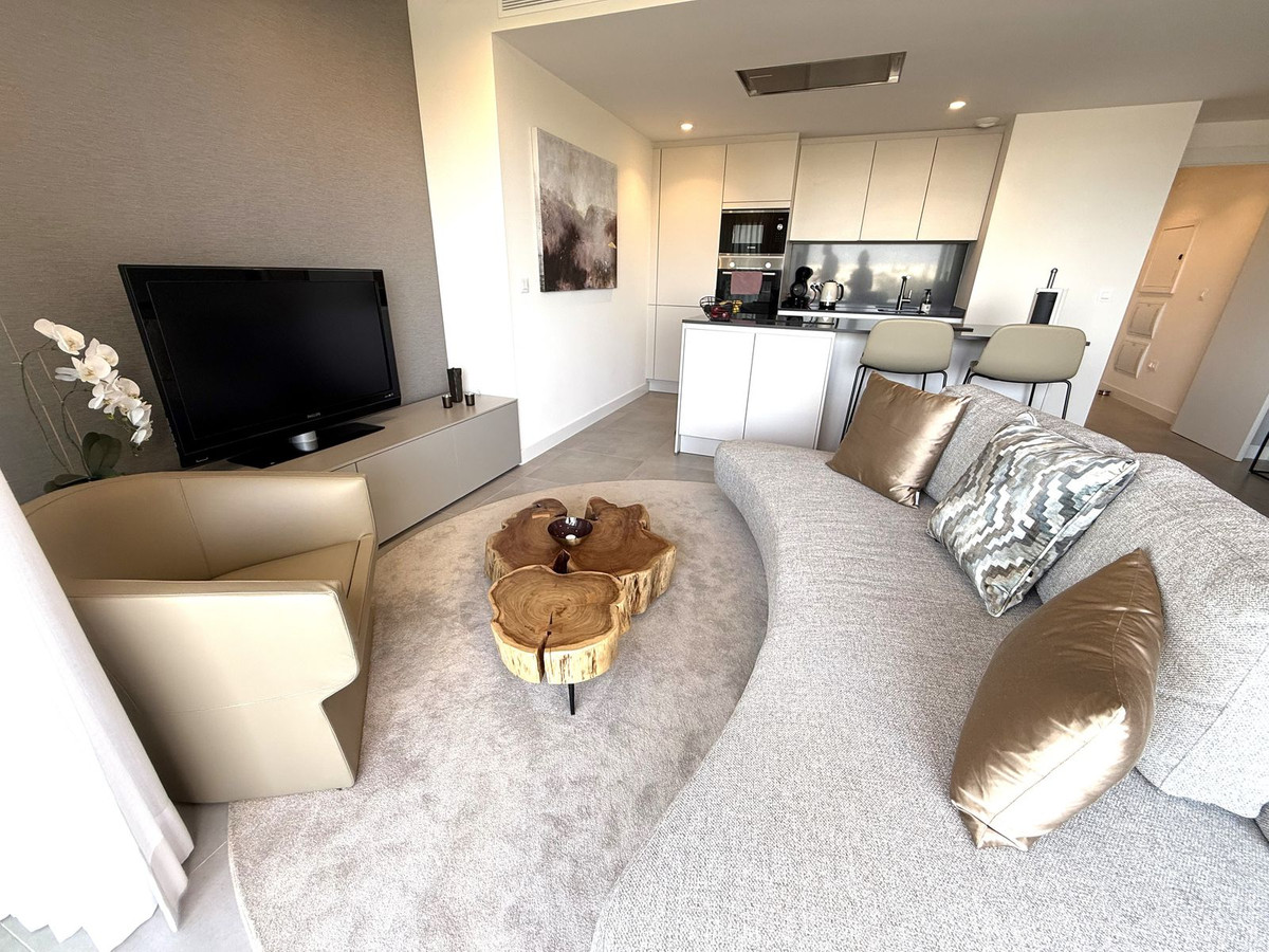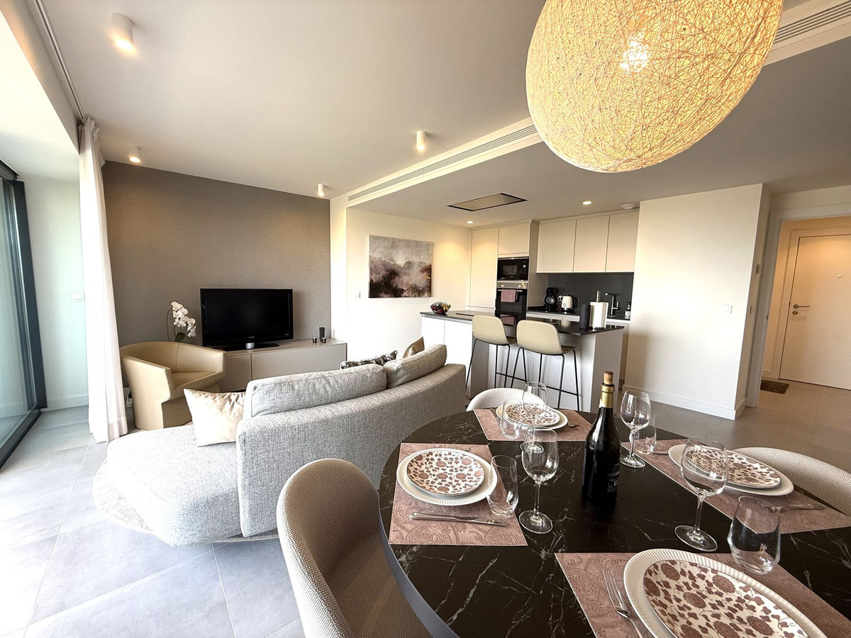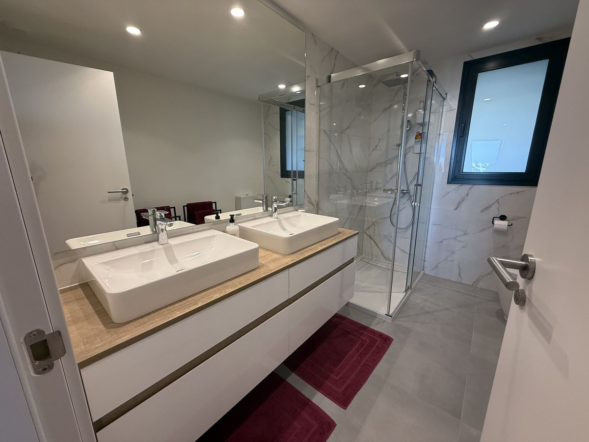 The master bedroom offers direct access to the terrace and enjoys spectacular views of the sea – a rare and privileged feature. The second bedroom is also generously sized, and both bathrooms are equipped with walk-in showers and finished in a modern, minimalist style. Throughout the apartment, high-quality materials, tasteful decoration, and abundant natural light create an atmosphere of calm and understated luxury.