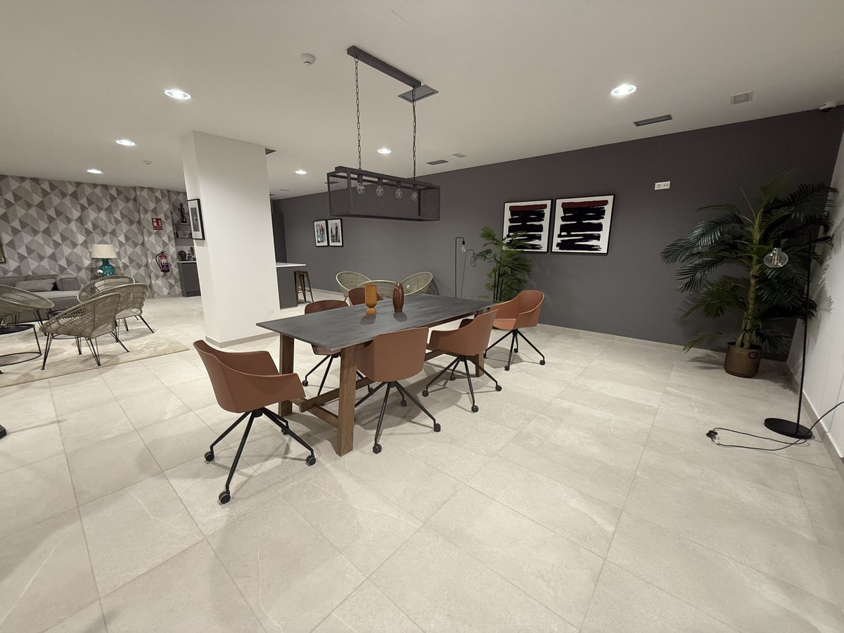 The interior living space of 102 m² flows naturally into a spacious 28 m² terrace that faces southwest, ensuring sun from late morning until sunset. The layout includes an open-plan living and dining area with large sliding doors that open directly onto the terrace. The fully equipped kitchen is centered around a sleek island with integrated induction hob, combining elegance and functionality in a space designed for both cooking and socialising.