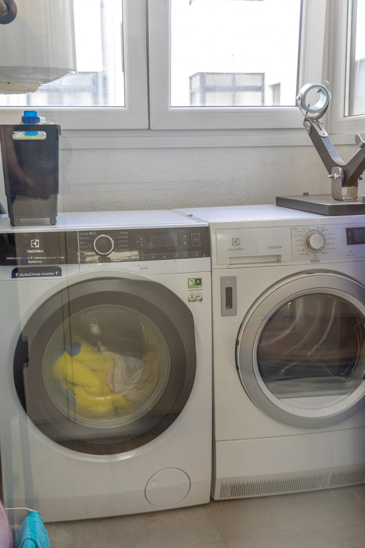 Extras include an advanced AirZone A/C system with room-by-room temperature control, washing machine and dryer, lift access, wheelchair accessibility, and a private underground parking space. The building is part of a gated community with 24-hour security and surveillance.